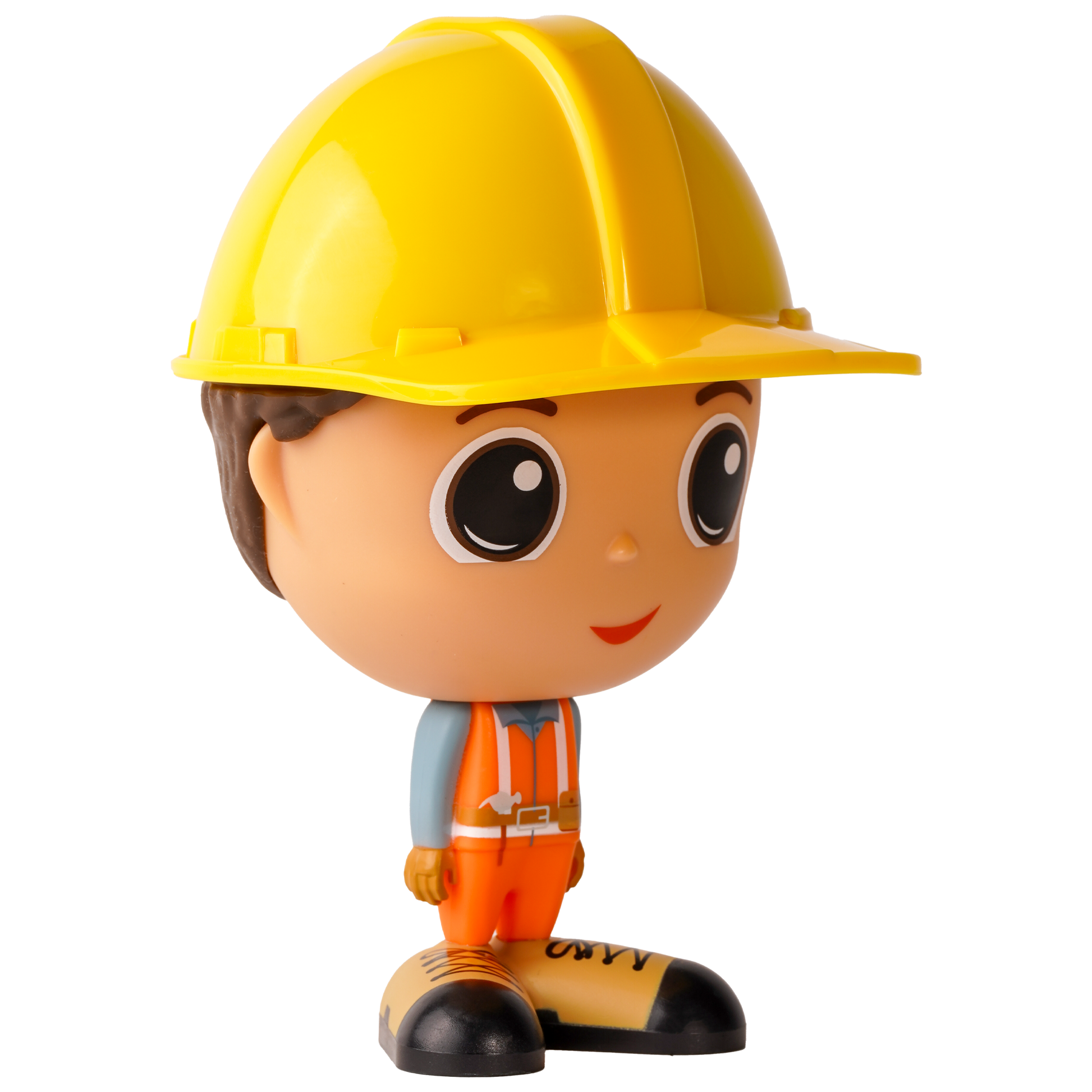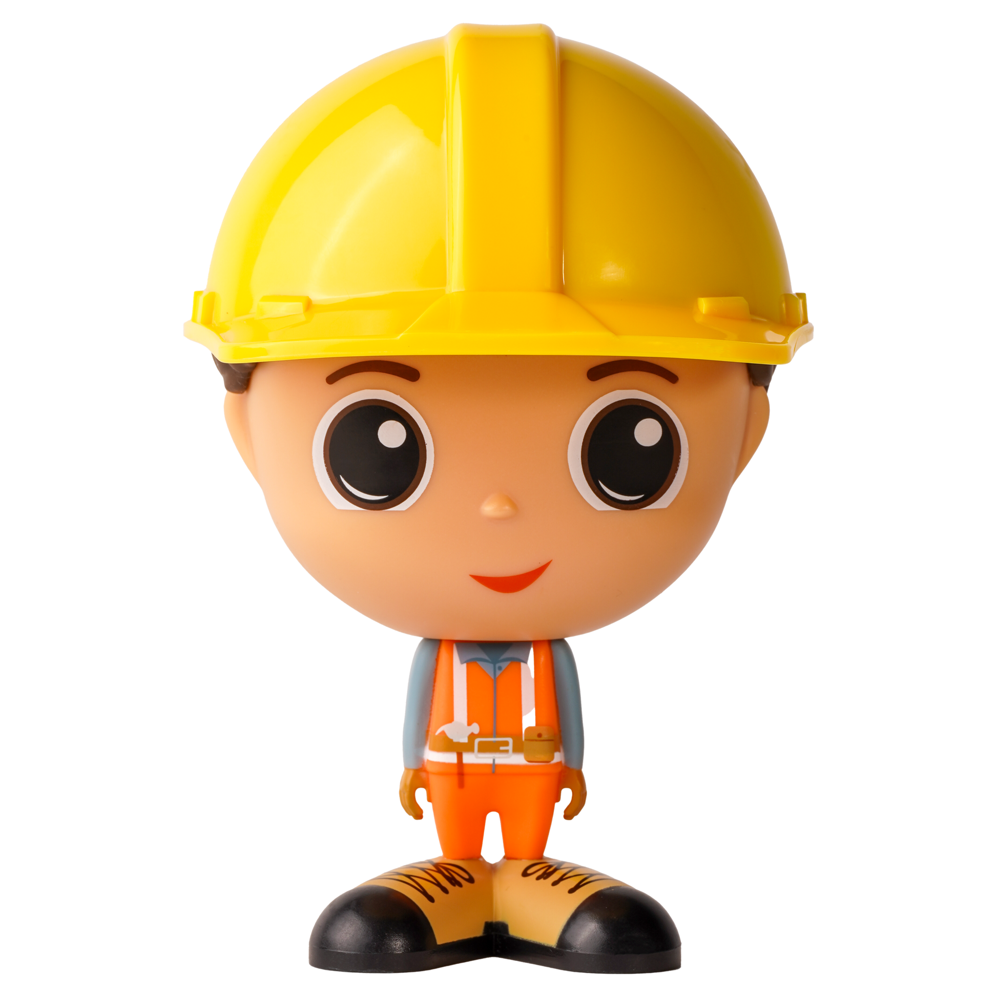 Chaque figurine de construction Flek est prête à travailler avec son casque jaune et ses bottes de chantier. Ils portent leur ceinture à outils par-dessus leur veste de sécurité et sont prêts à construire.