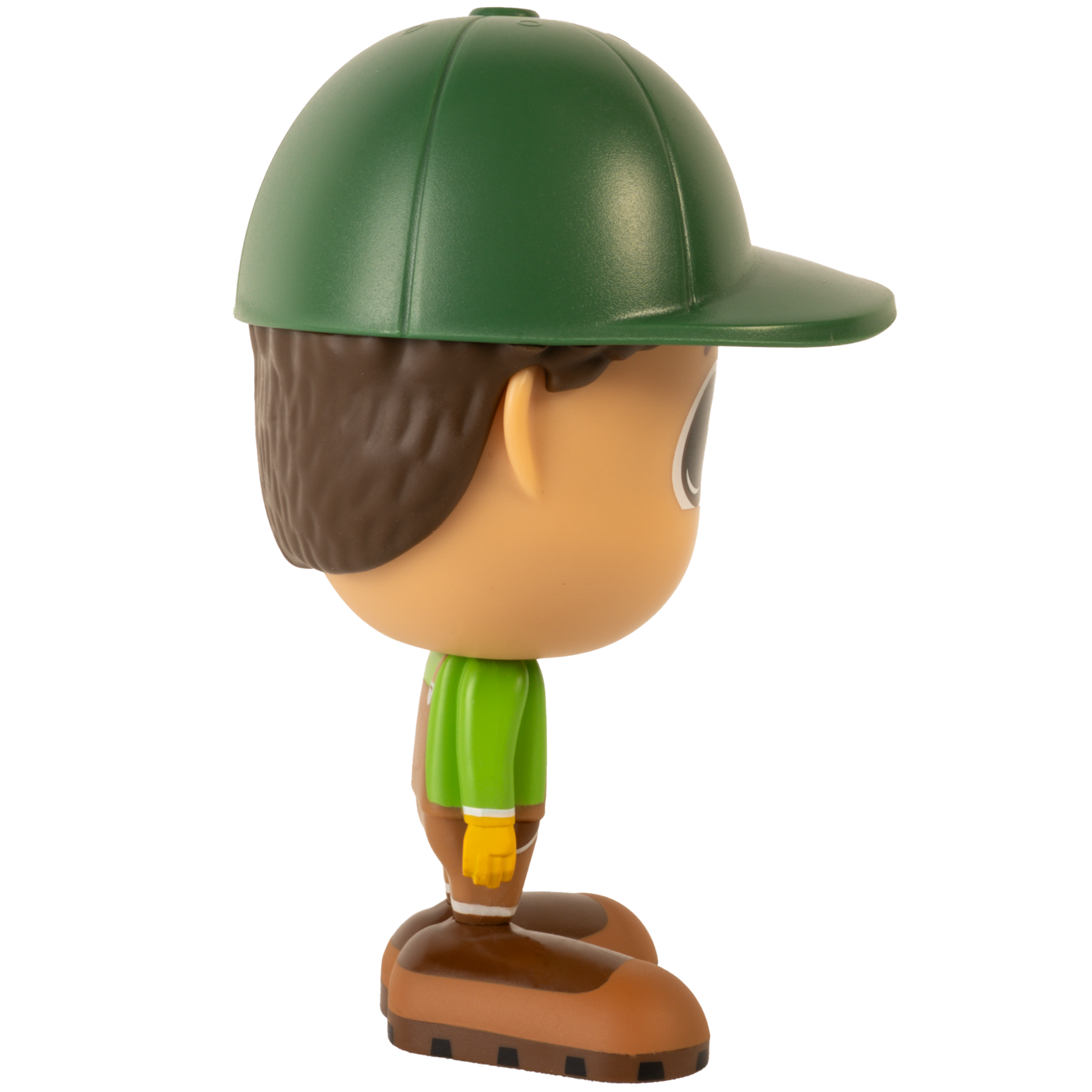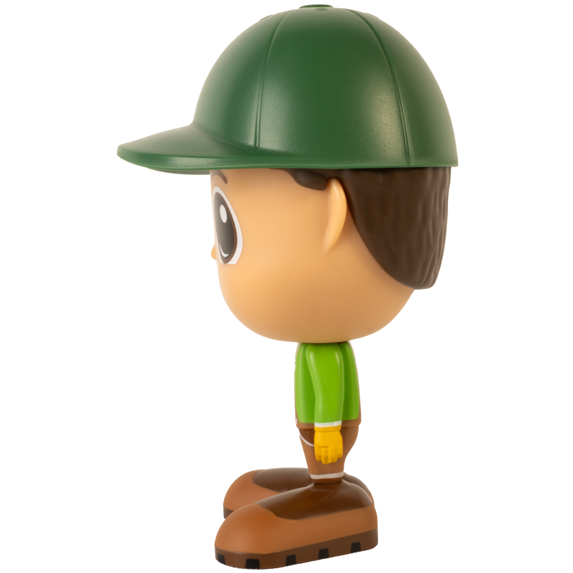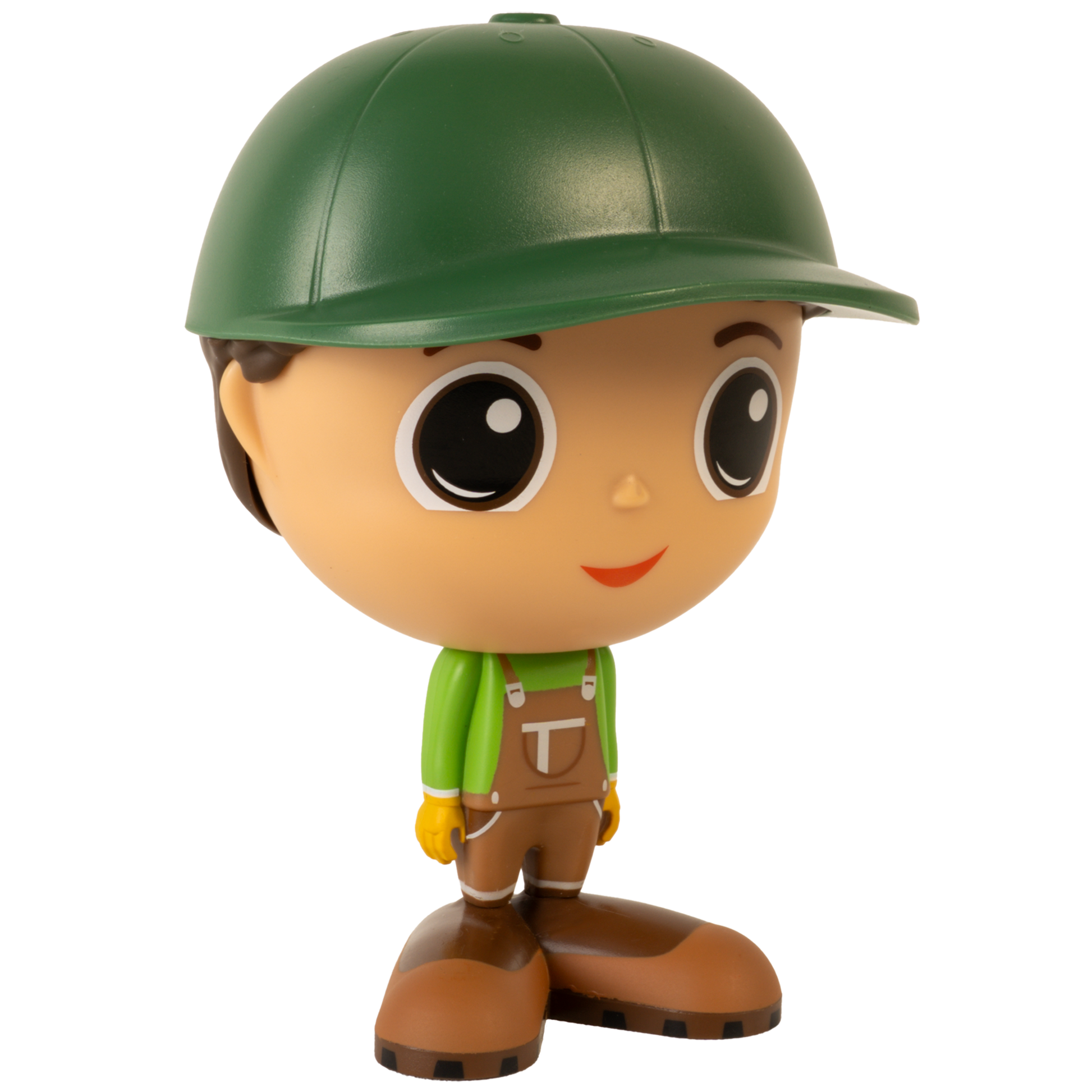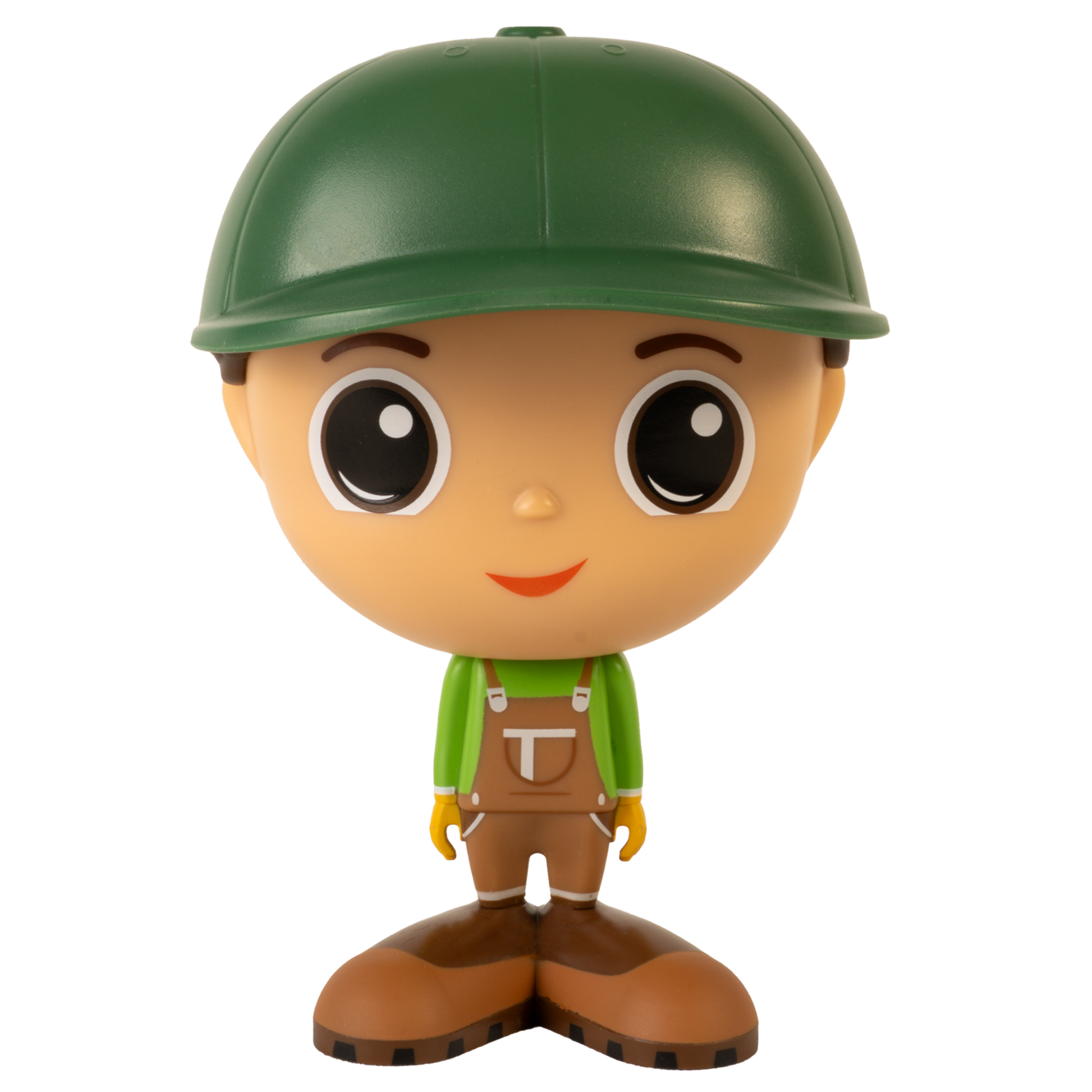 Chaque figurine de fermier Flek porte une chemise verte, une salopette de travail brune et une casquette assortie, parfaites pour les journées bien remplies à la ferme.