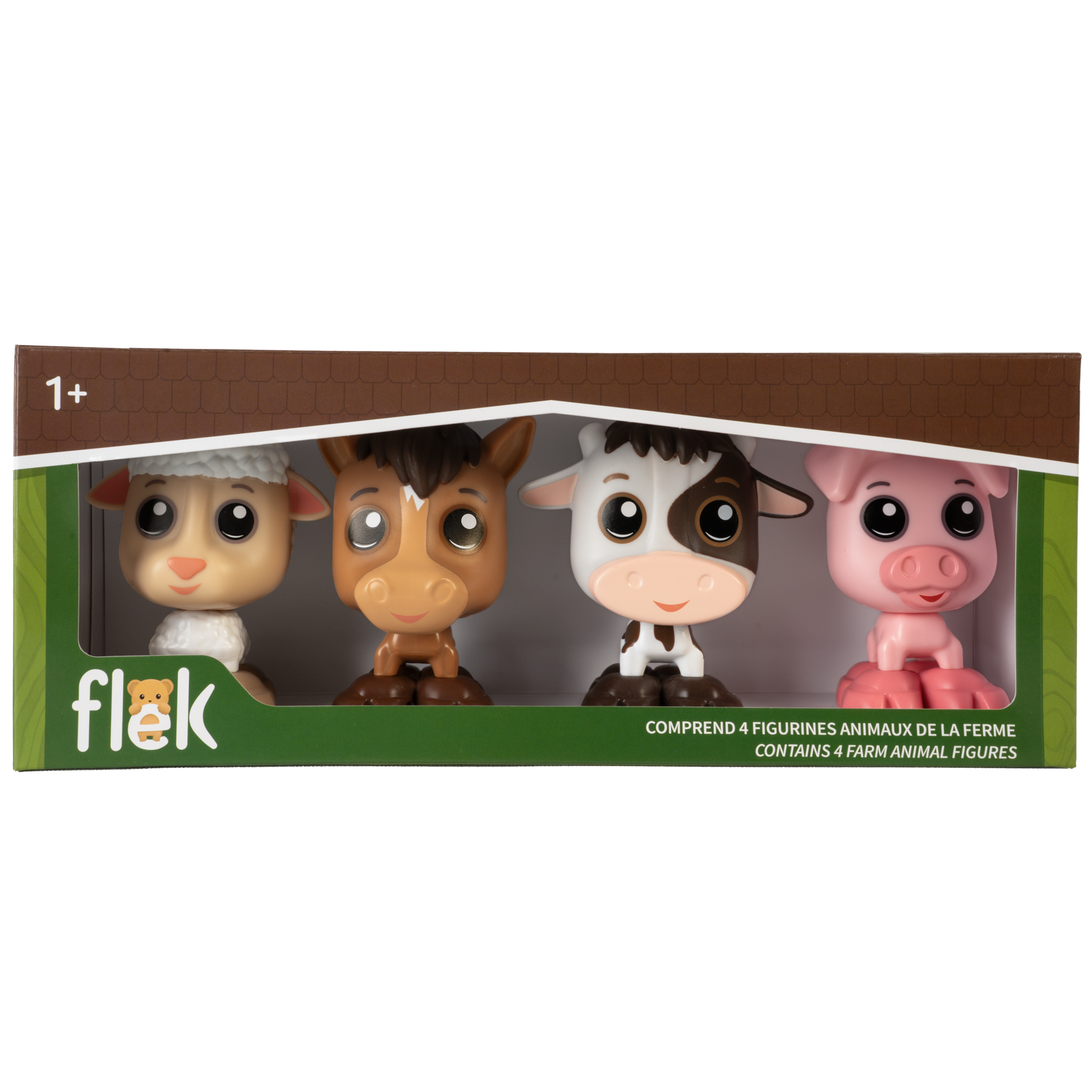 Les animaux de la ferme Flek forment une joyeuse équipe: le mouton, le cheval, la vache et le cochon vivent ensemble de grandes aventures au grand air. Attachants et pleins de caractère, ils accompagnent les figurines Flek dans tous les travaux et les jeux de la ferme.