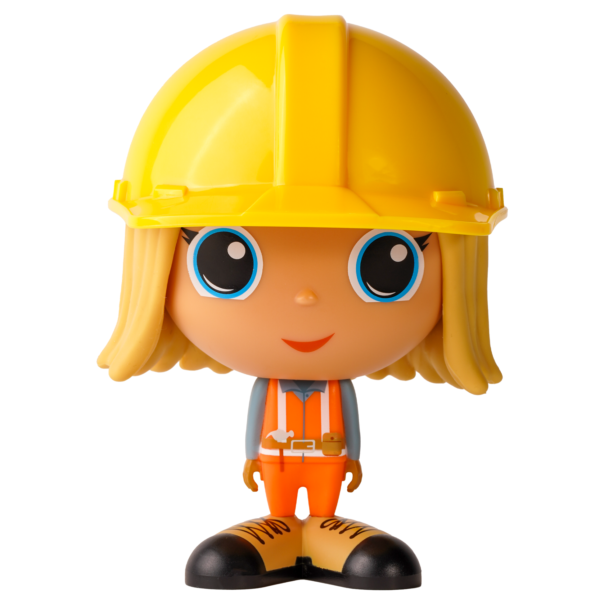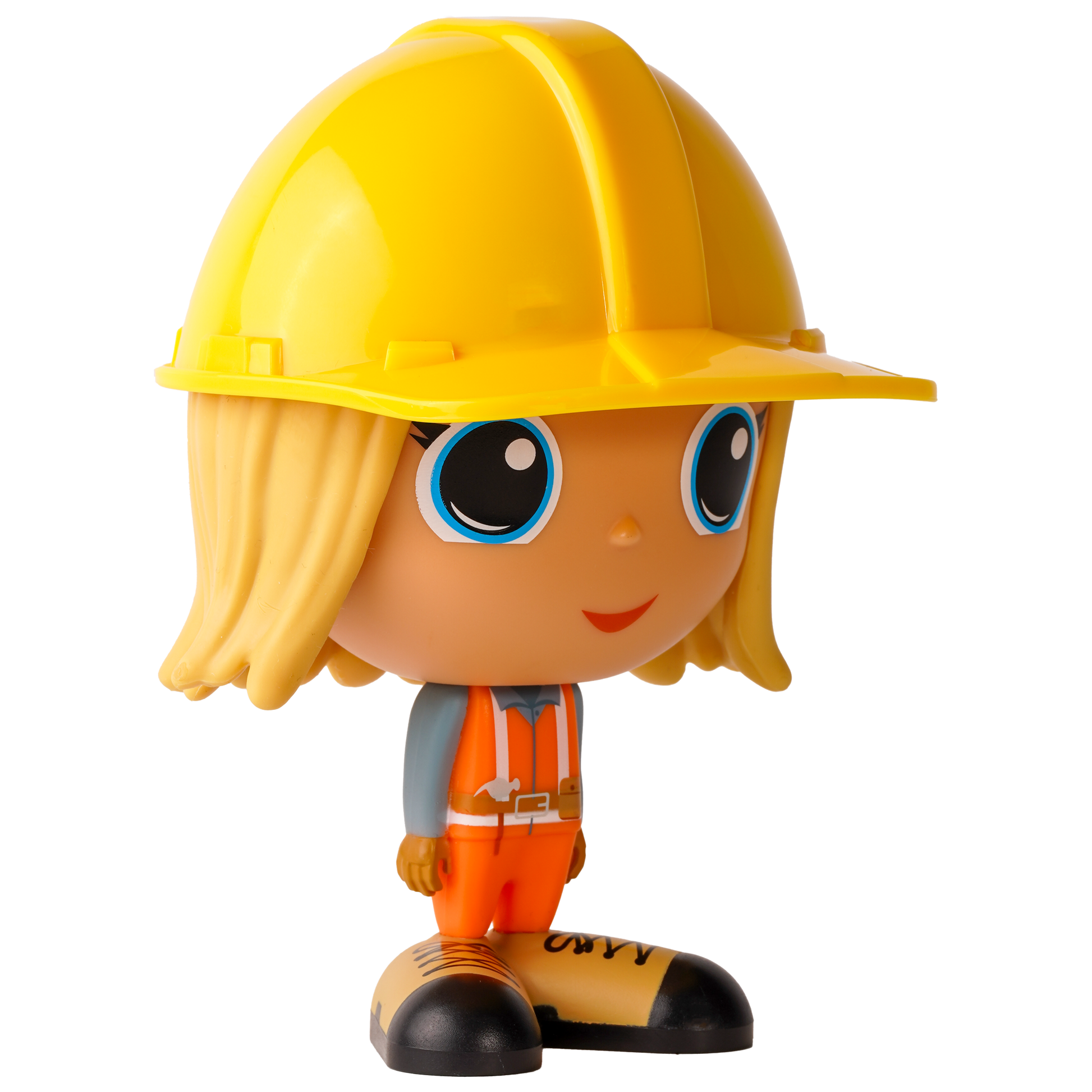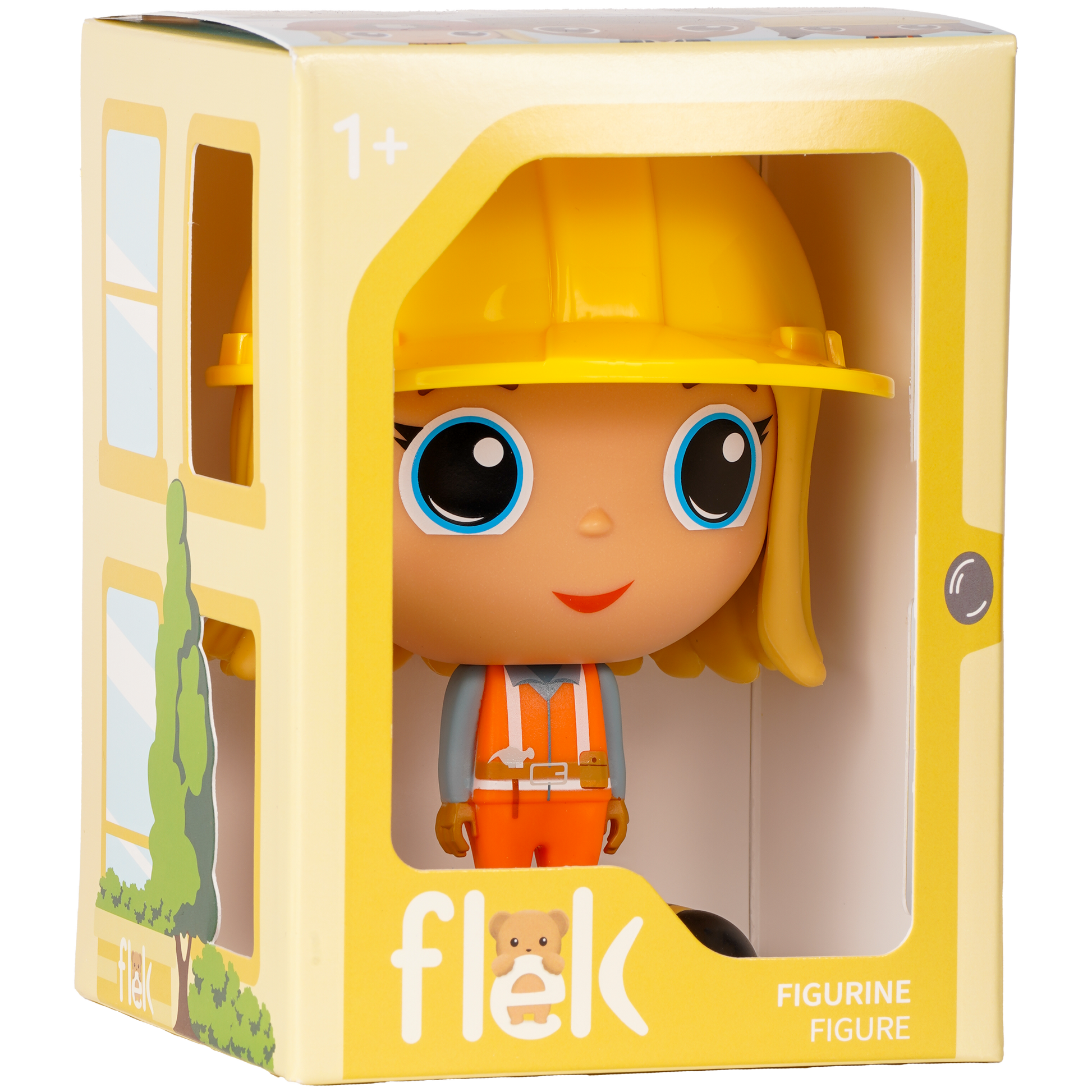 Chaque figurine de construction Flek est prête à travailler avec son casque jaune et ses bottes de chantier. Ils portent leur ceinture à outils par-dessus leur veste de sécurité et sont prêts à construire.