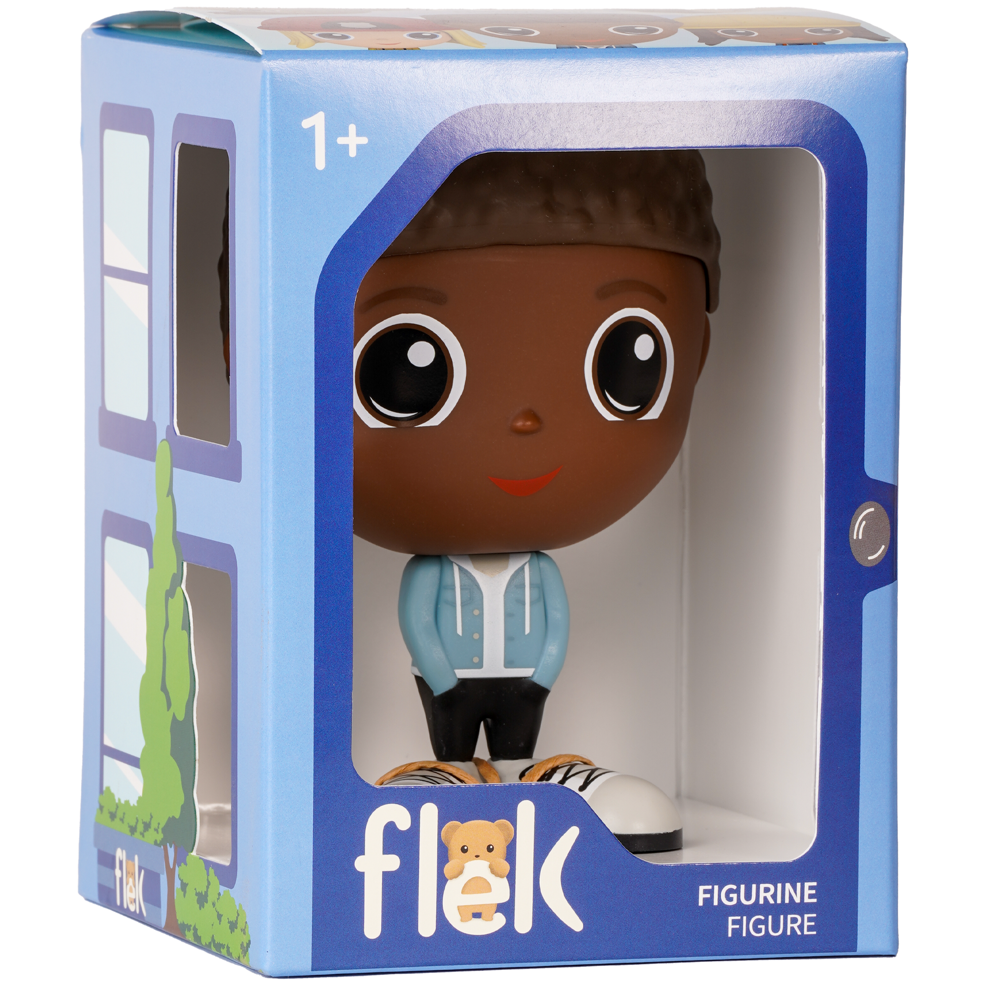 Chaque figurine à la ville Flek porte une veste en jean classique sur un chandail blanc et un pantalon noir parfaits pour les aventures urbaines.