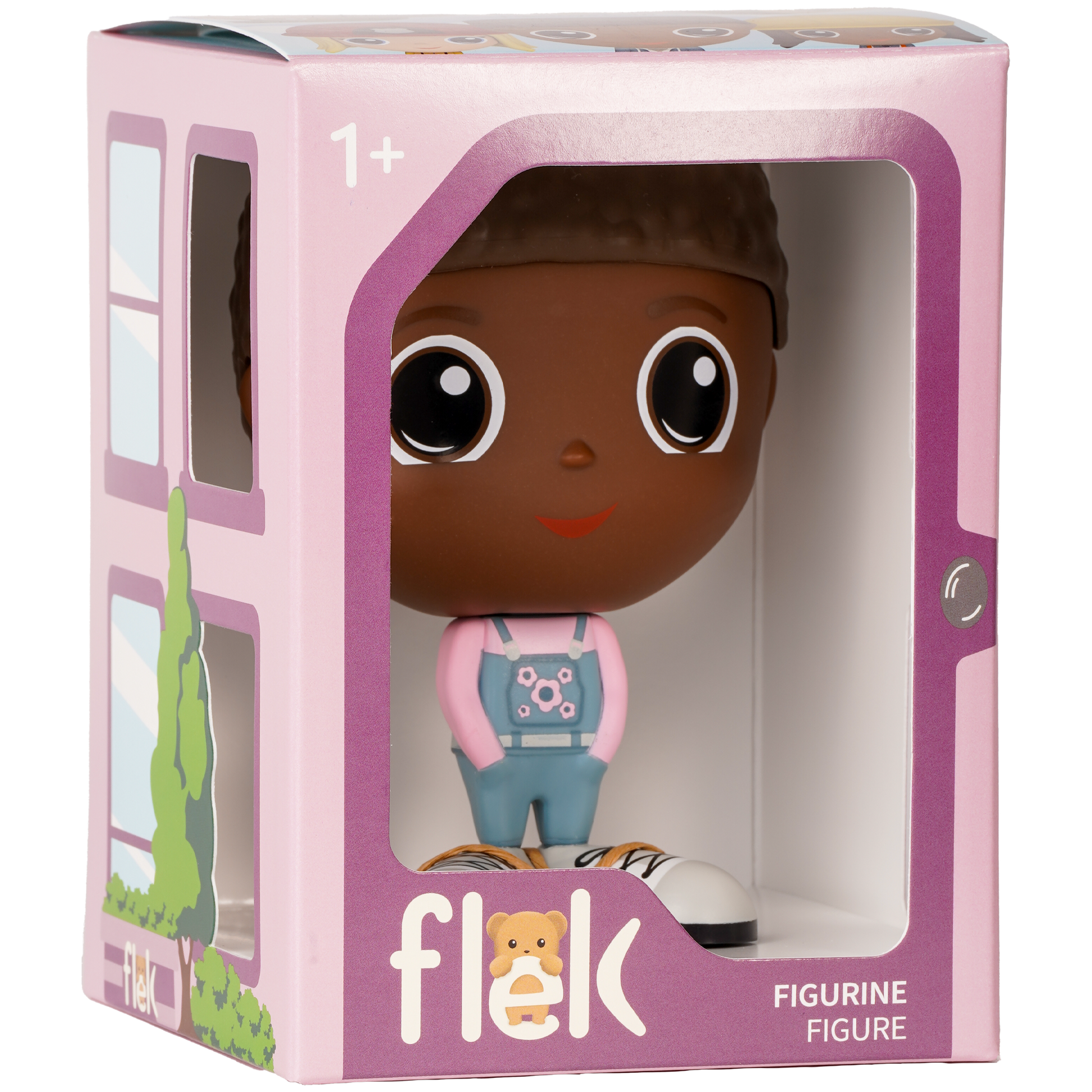 Chaque figurine au parc Flek est prête pour les aventures de plein air avec leur salopette en jean et leur chandail rose. La touche de rose sur les chaussures vient compléter l’ensemble.