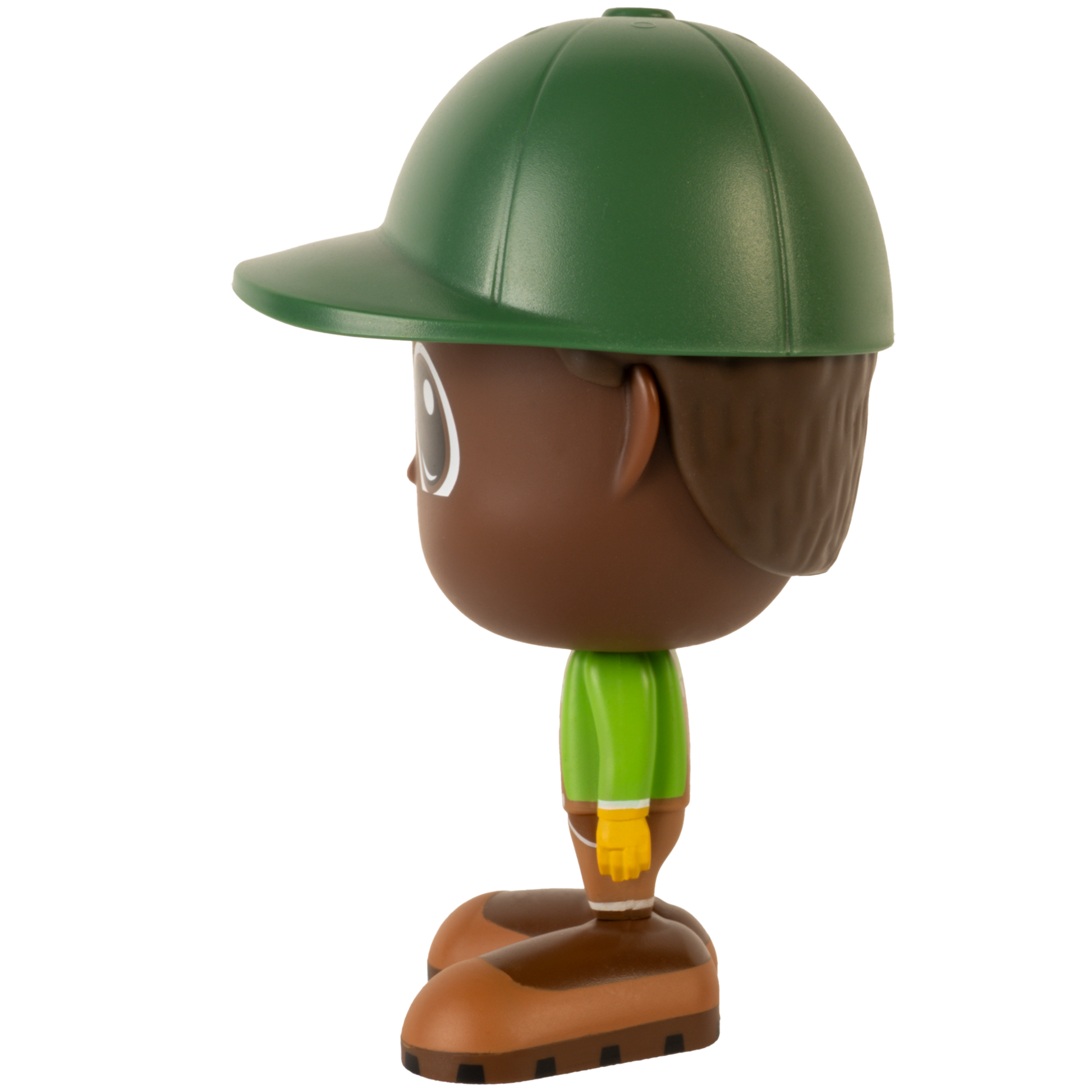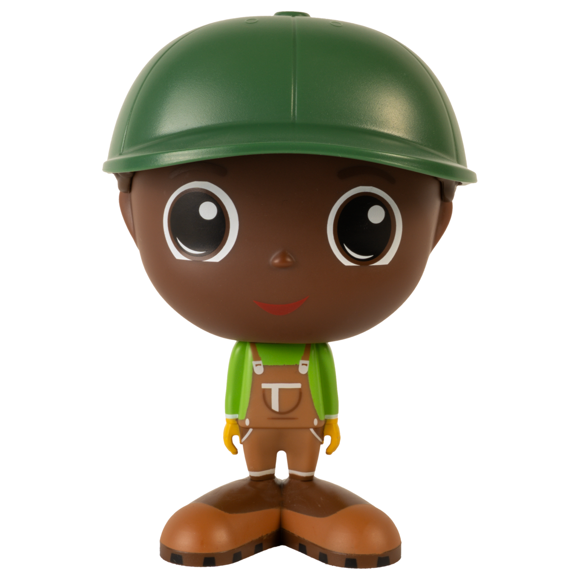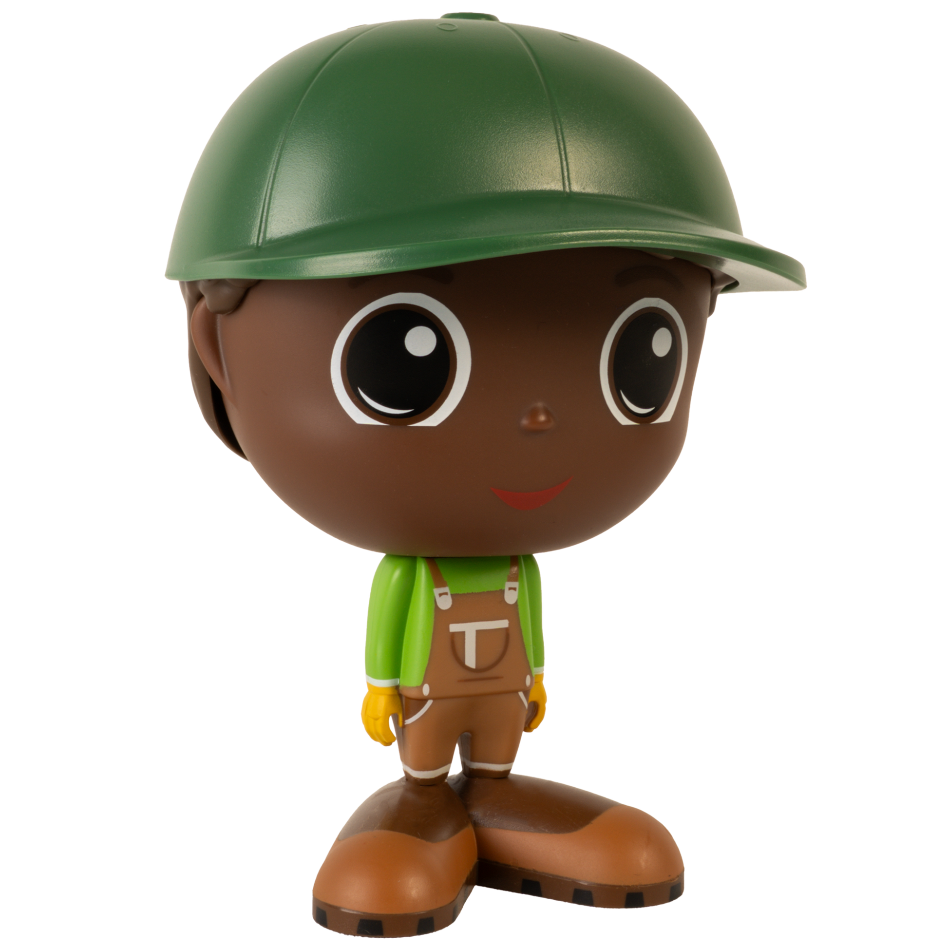 Chaque figurine de fermier Flek porte une chemise verte, une salopette de travail brune et une casquette assortie, parfaites pour les journées bien remplies à la ferme.