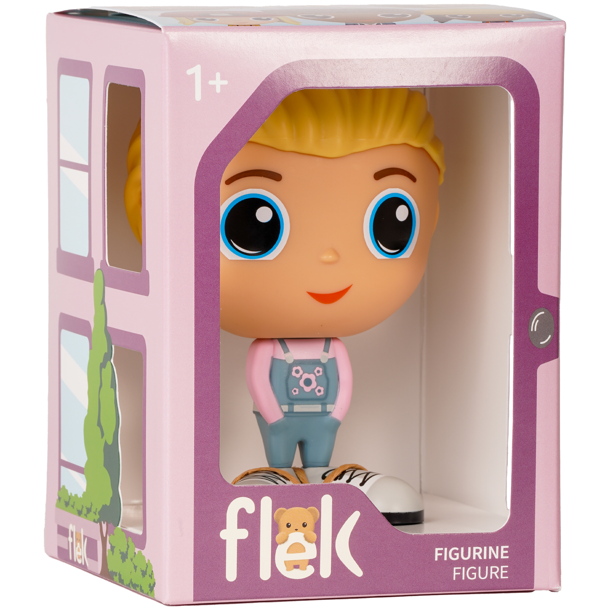 Chaque figurine au parc Flek est prête pour les aventures de plein air avec leur salopette en jean et leur chandail rose. La touche de rose sur les chaussures vient compléter l’ensemble.