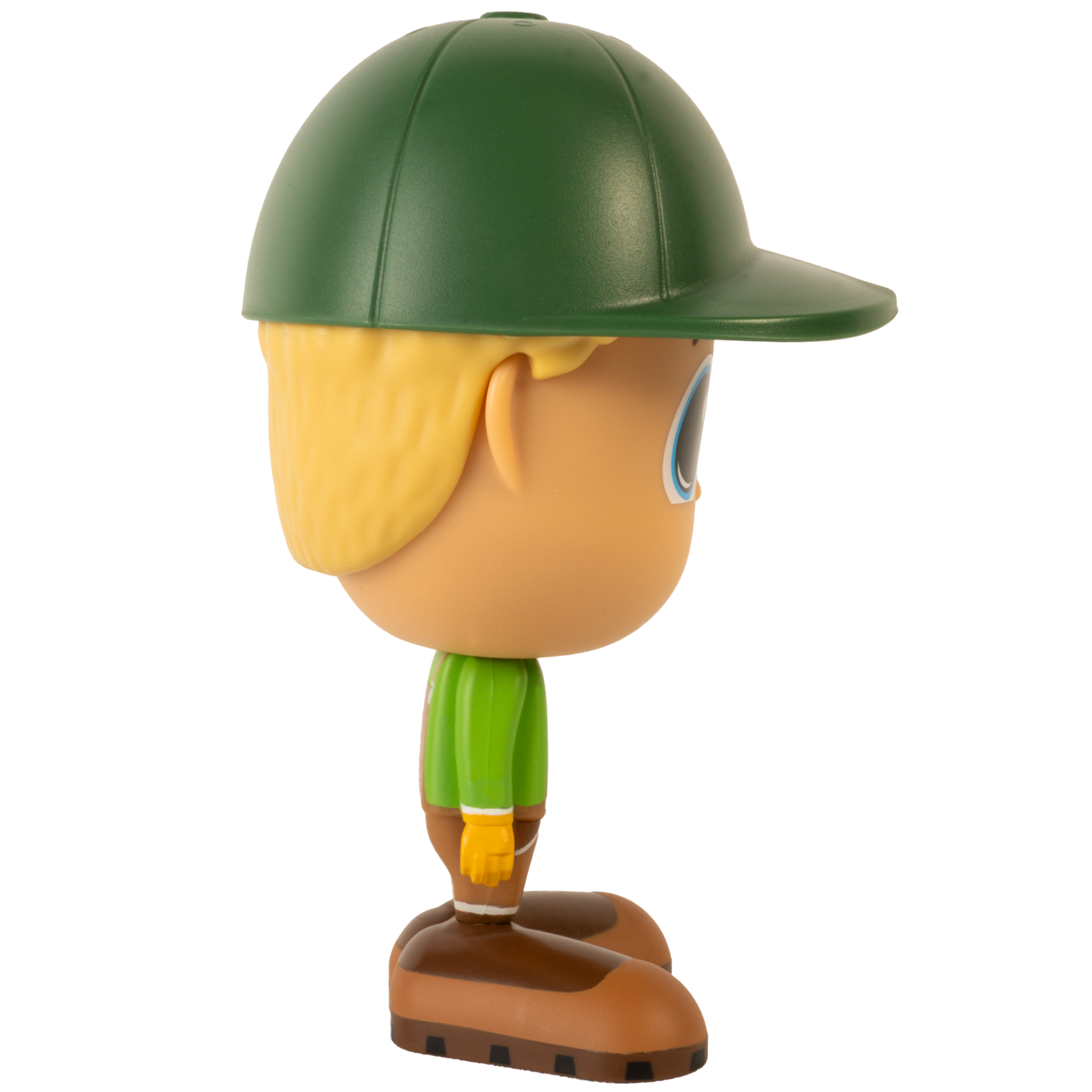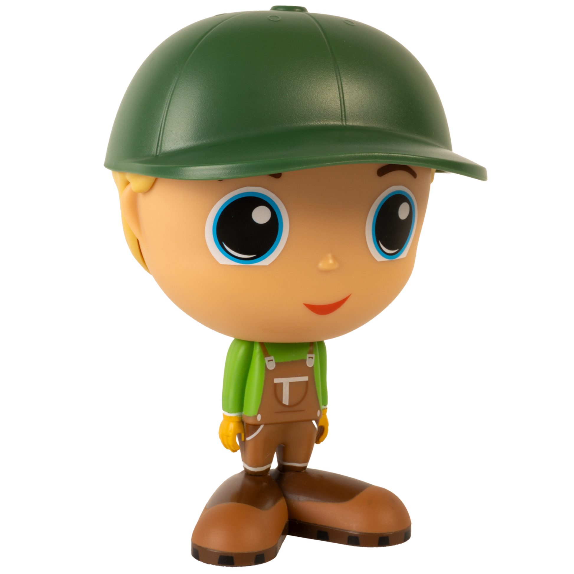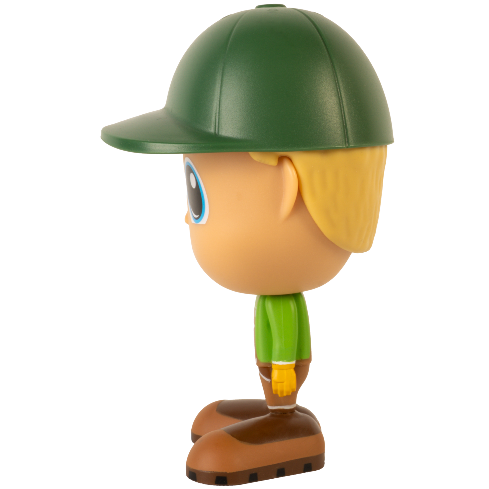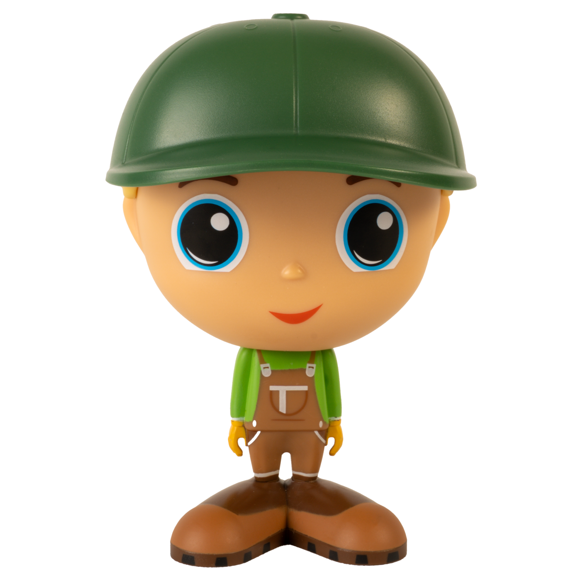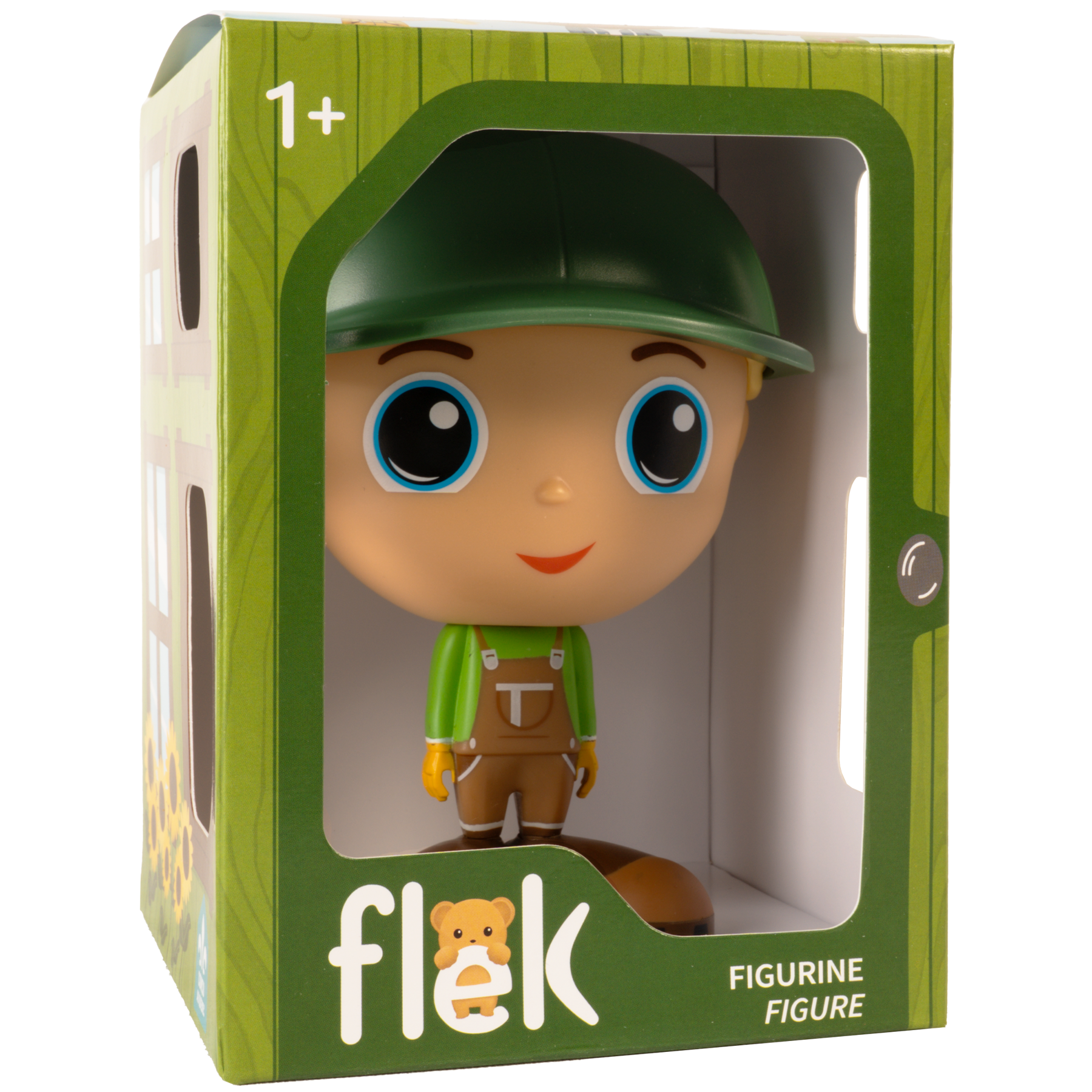 Chaque figurine de fermier Flek porte une chemise verte, une salopette de travail brune et une casquette assortie, parfaites pour les journées bien remplies à la ferme.