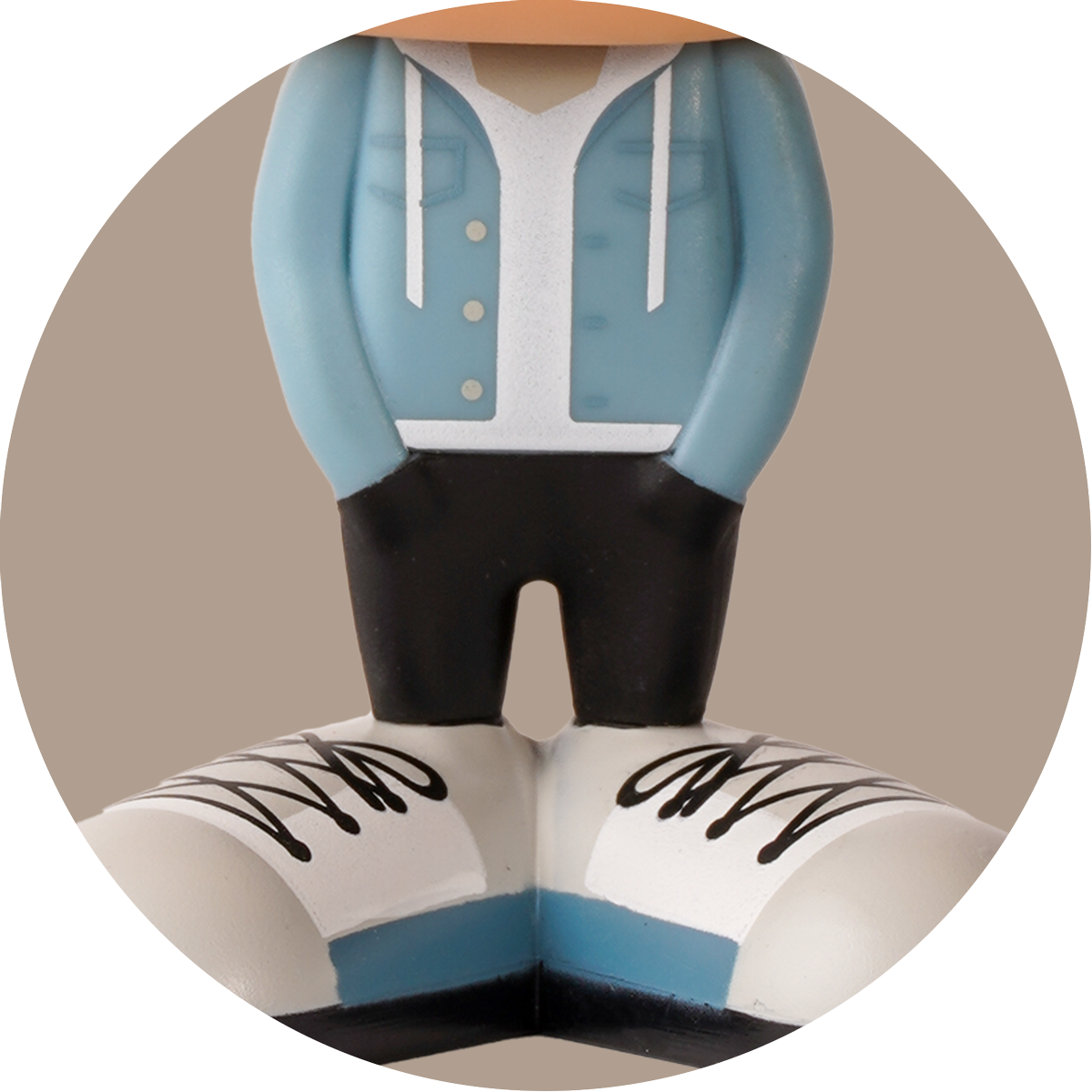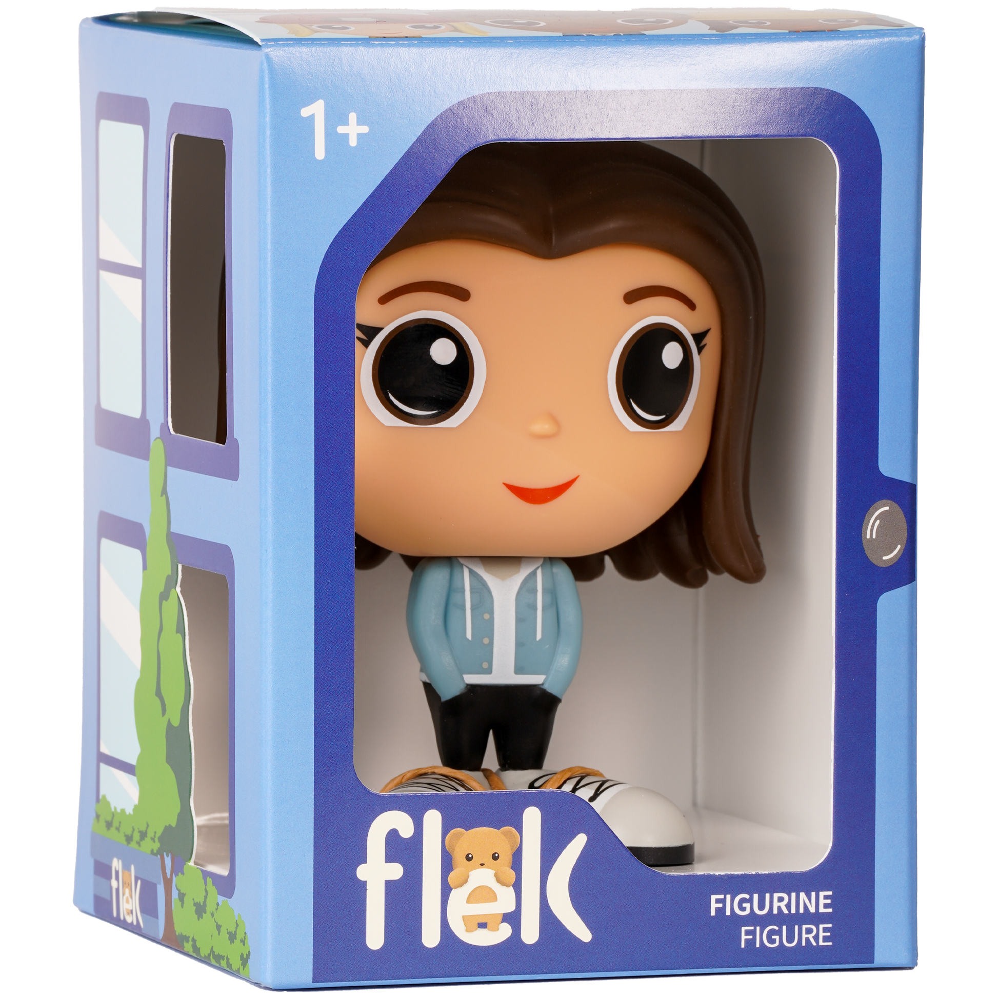Chaque figurine à la ville Flek porte une veste en jean classique sur un chandail blanc et un pantalon noir parfaits pour les aventures urbaines.