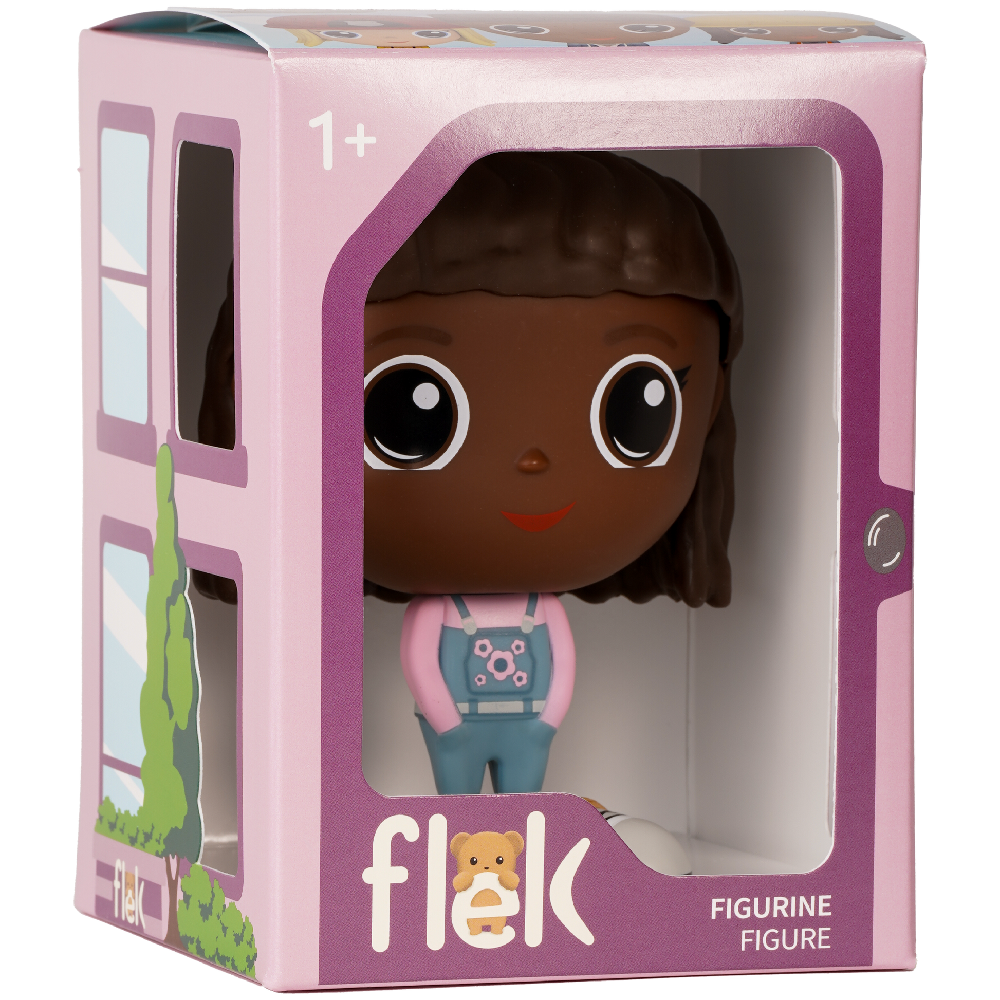 Chaque figurine au parc Flek est prête pour les aventures de plein air avec leur salopette en jean et leur chandail rose. La touche de rose sur les chaussures vient compléter l’ensemble.