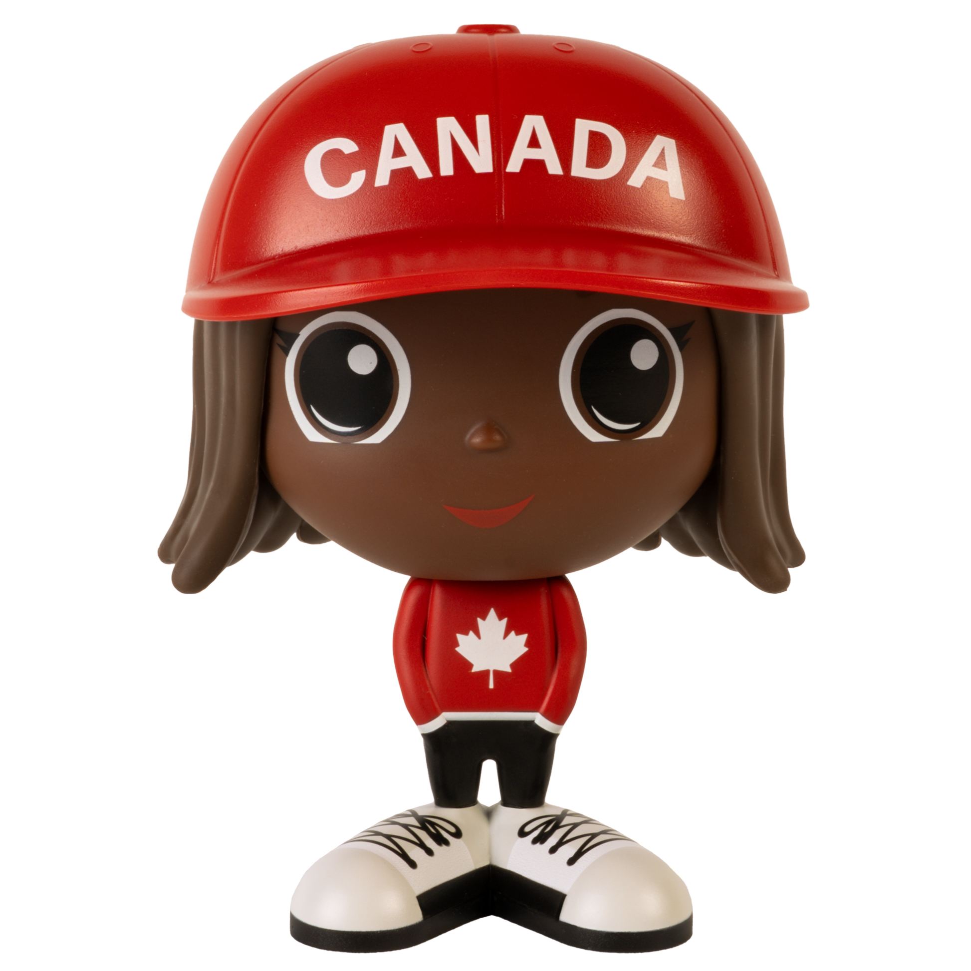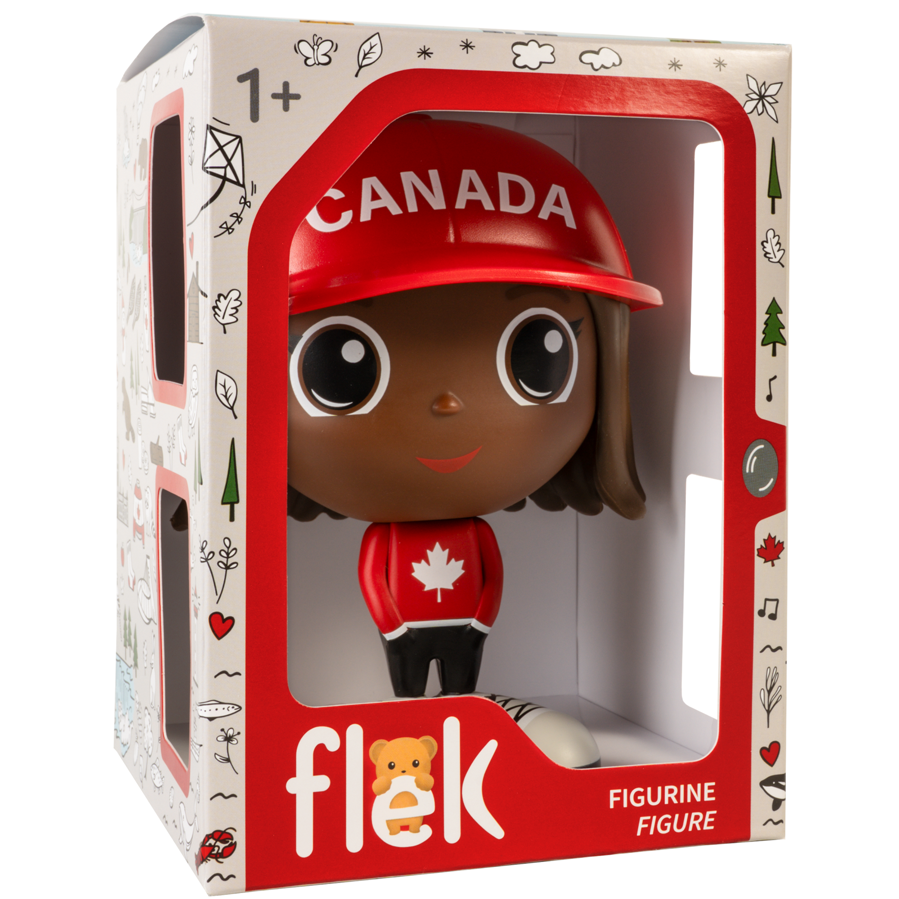 Chaque figurine Flek du Canada porte fièrement les couleurs du pays: un chandail rouge orné d’une feuille d’érable blanche, un pantalon noir et une casquette rouge marquée CANADA à l’avant et d’une feuille d’érable à l’arrière.