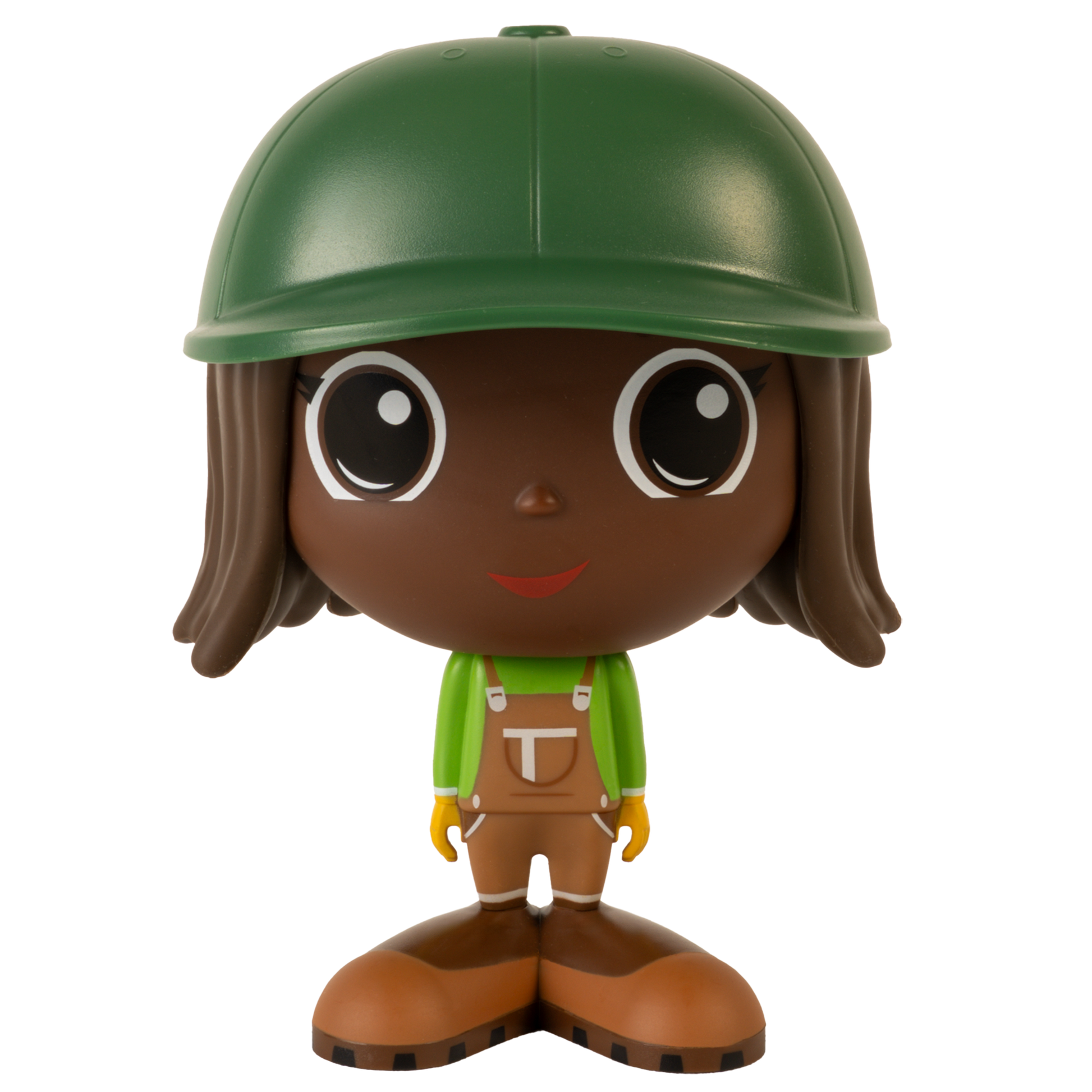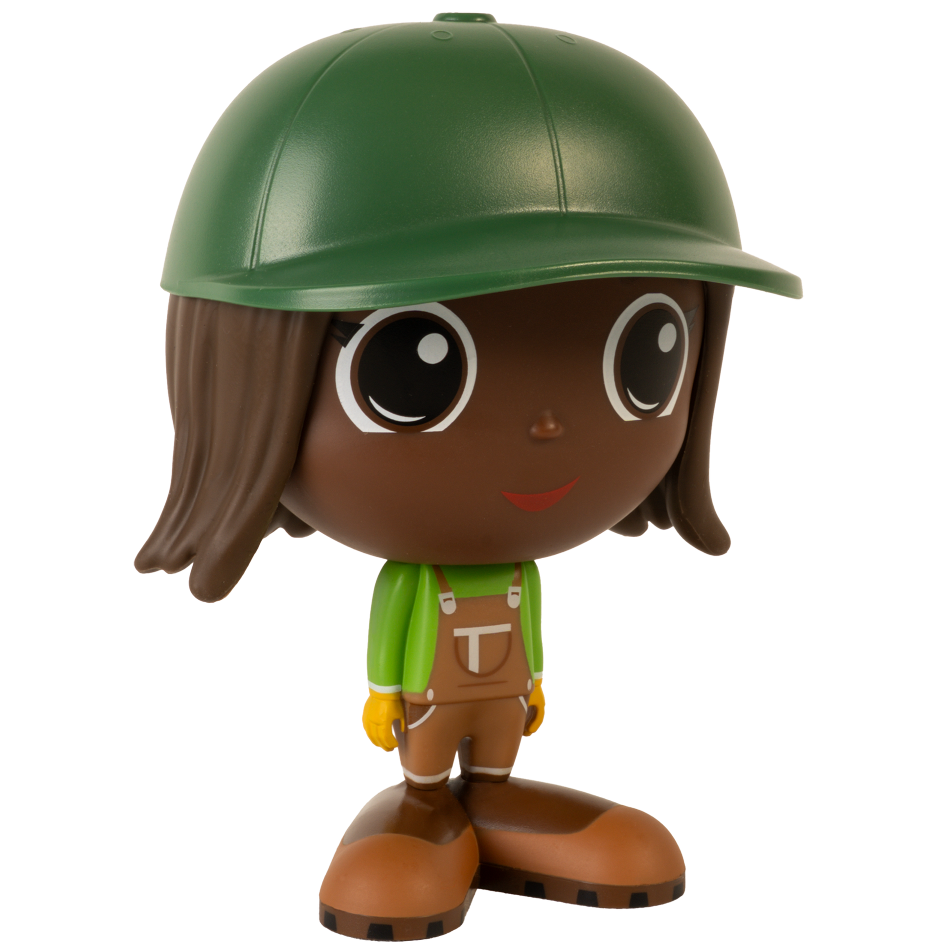 Chaque figurine de fermier Flek porte une chemise verte, une salopette de travail brune et une casquette assortie, parfaites pour les journées bien remplies à la ferme.