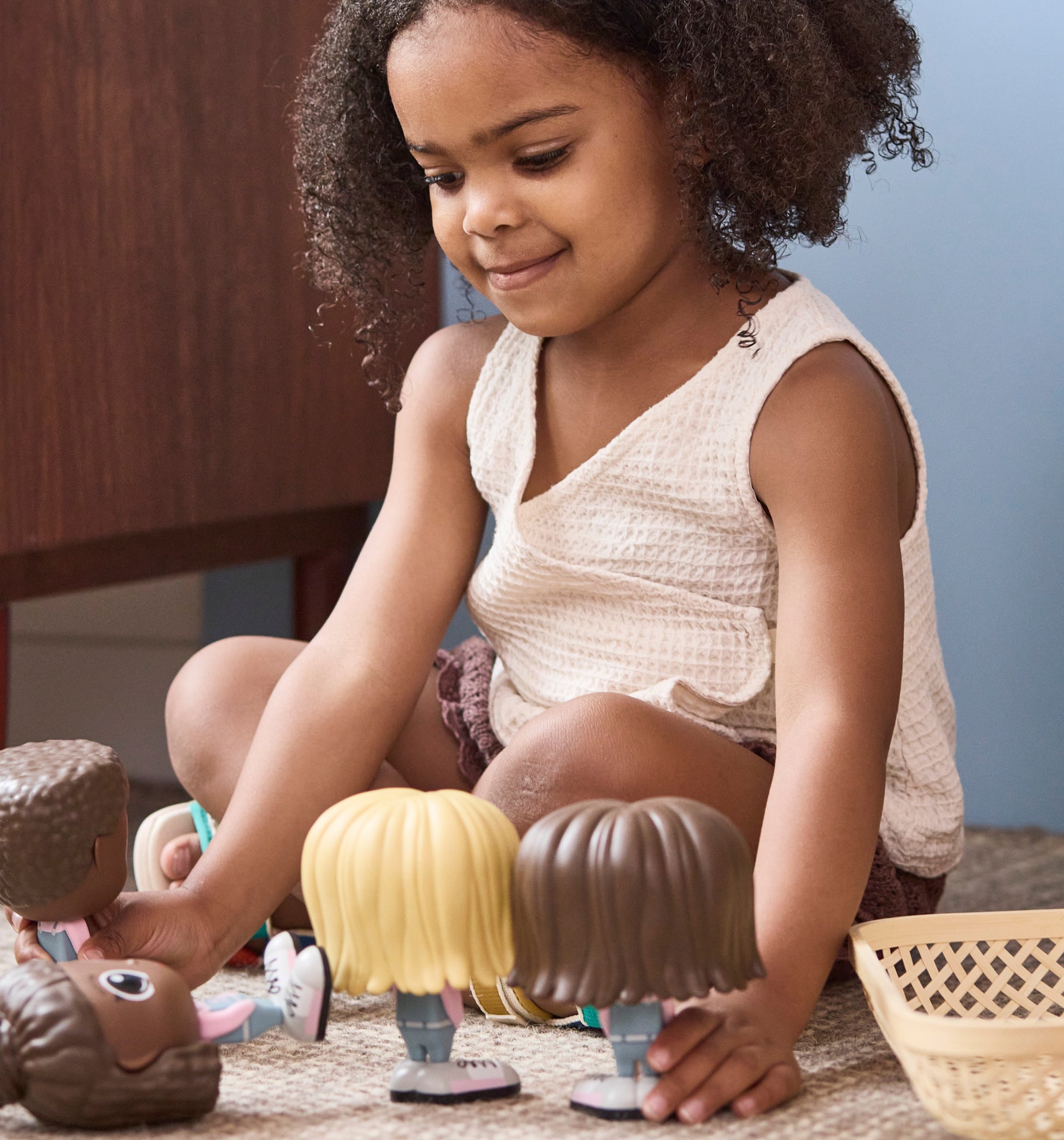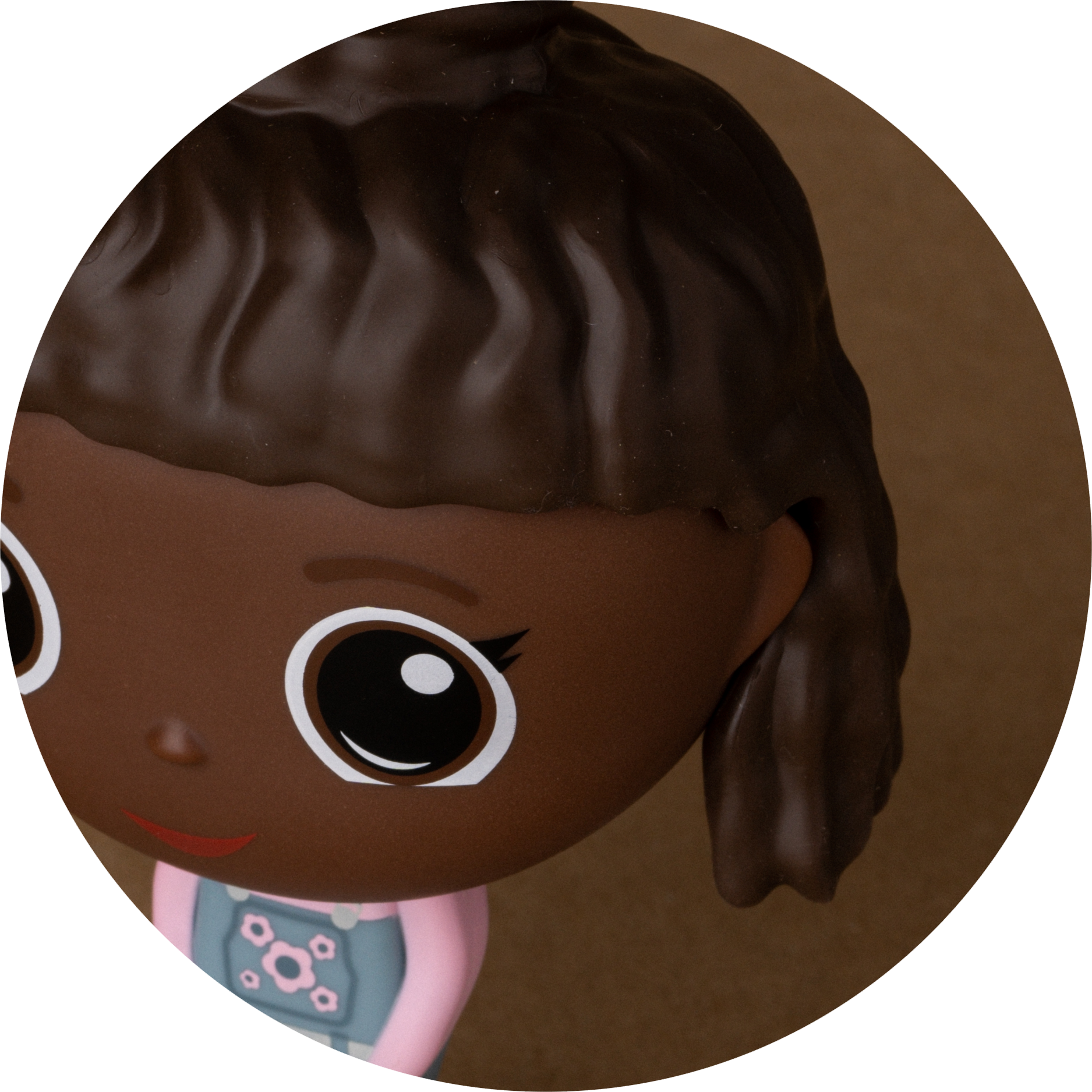 Avec une grosse tête et des grands yeux visuellement attrayants captent l’attention des enfants. En plus de l'attrait visuel, les cheveux texturés ajoutent un élément tactile qui font démarquer la tête de nos figurines et évoquent un sentiment de joie.