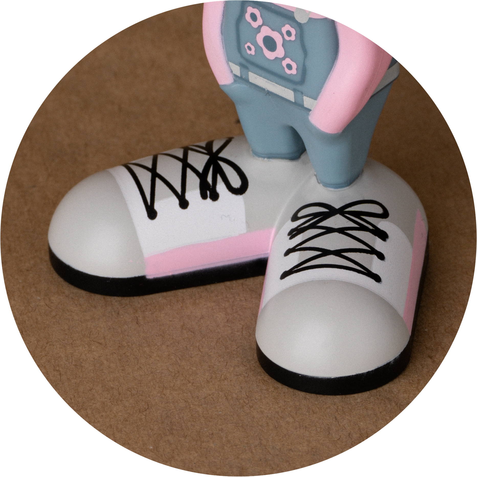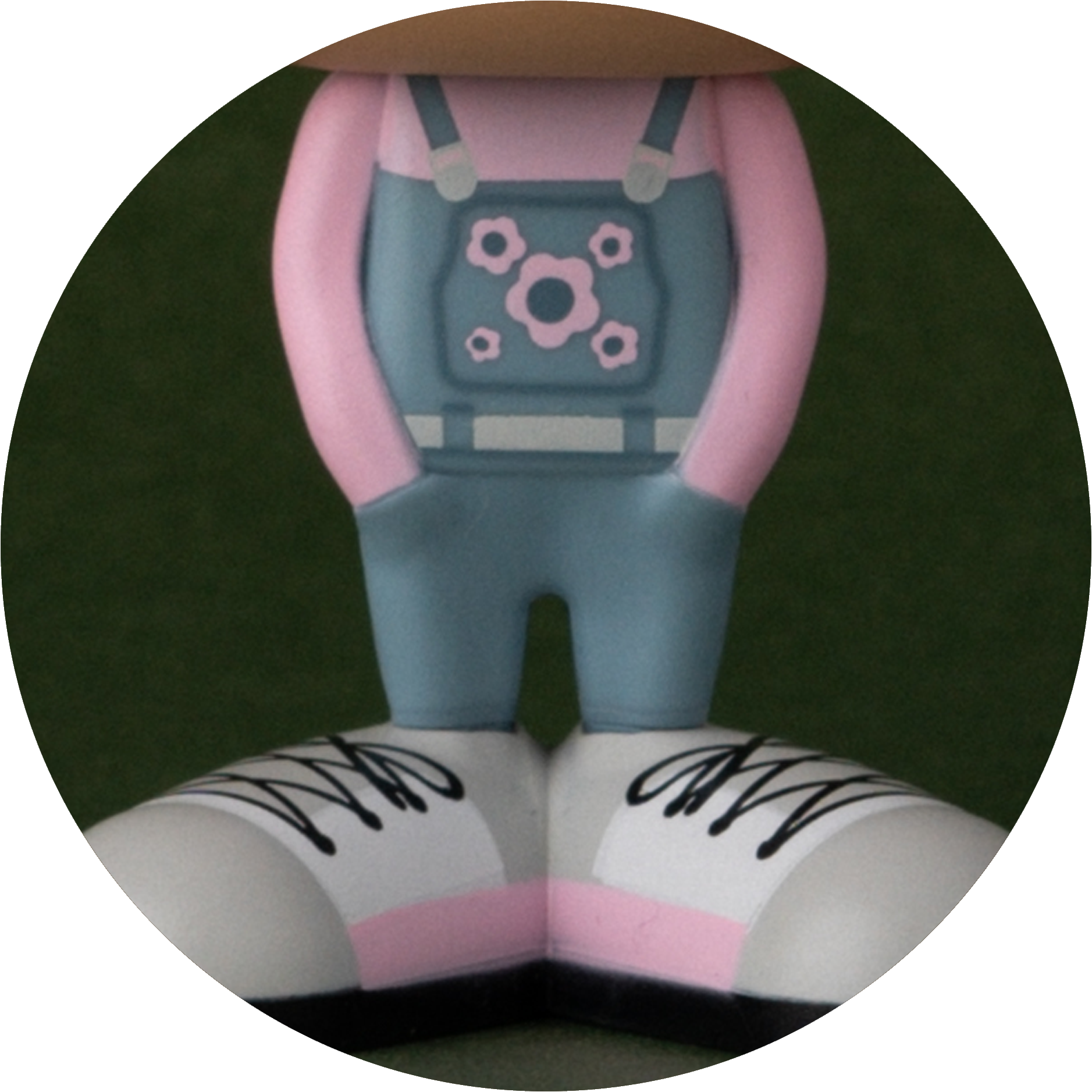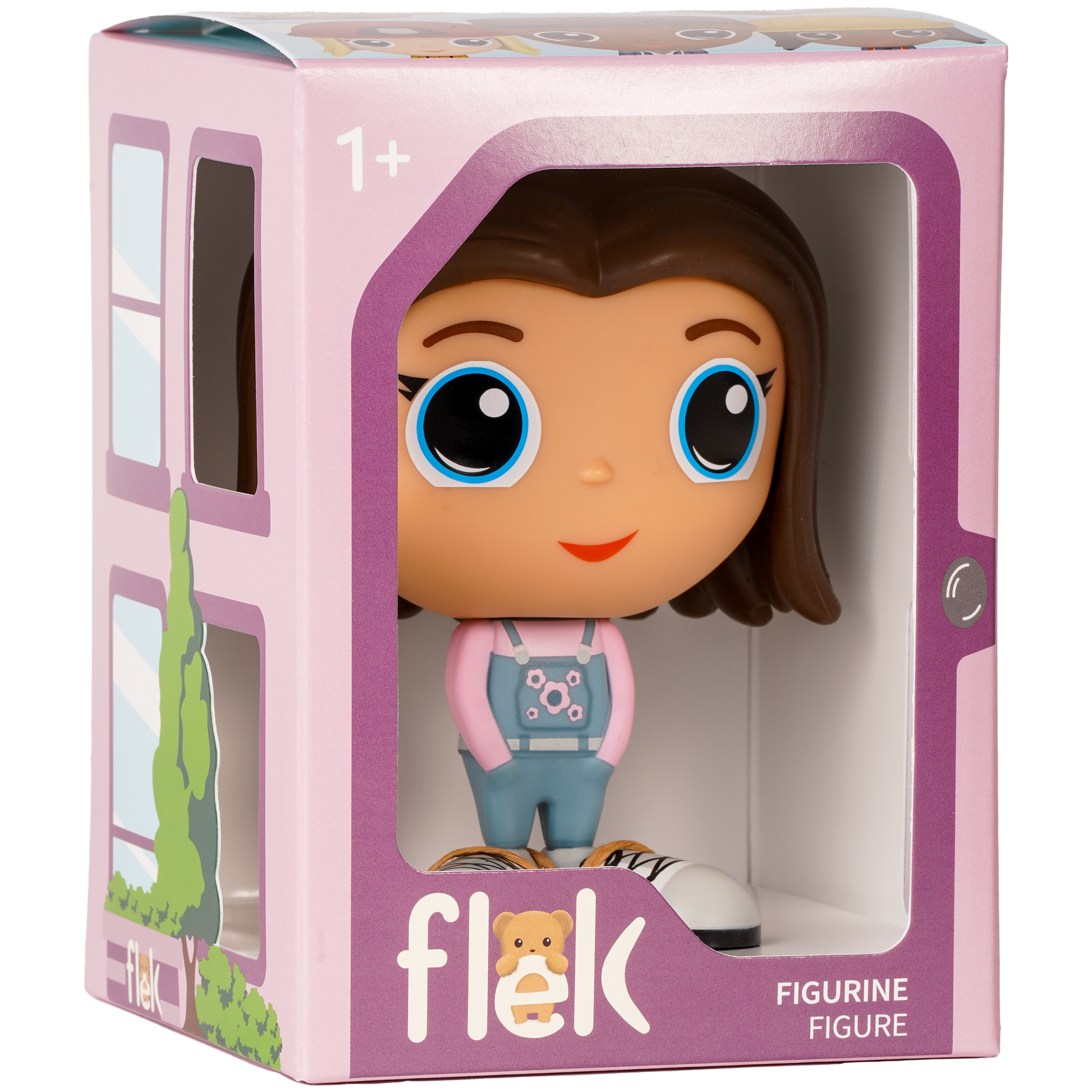 Chaque figurine au parc Flek est prête pour les aventures de plein air avec leur salopette en jean et leur chandail rose. La touche de rose sur les chaussures vient compléter l’ensemble.