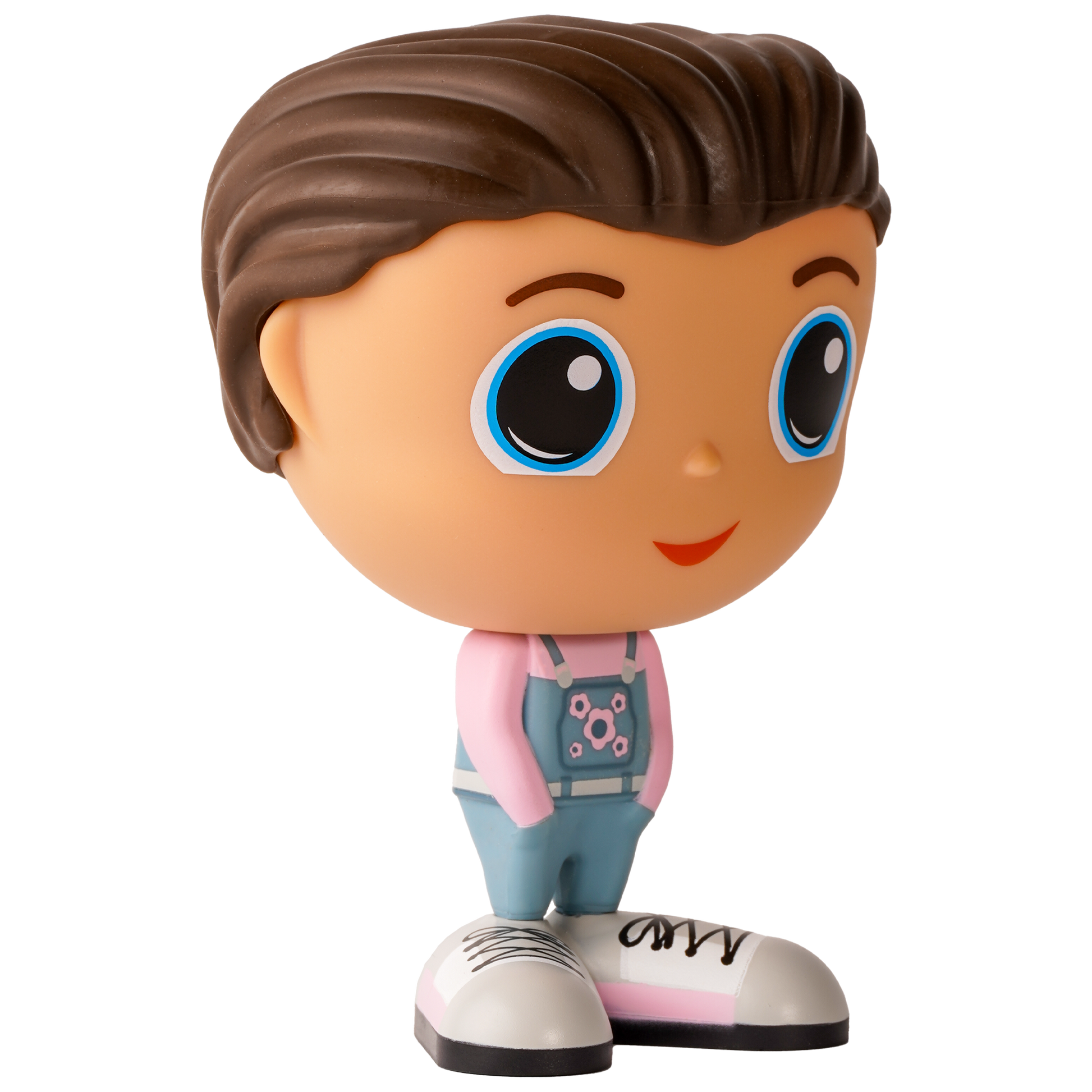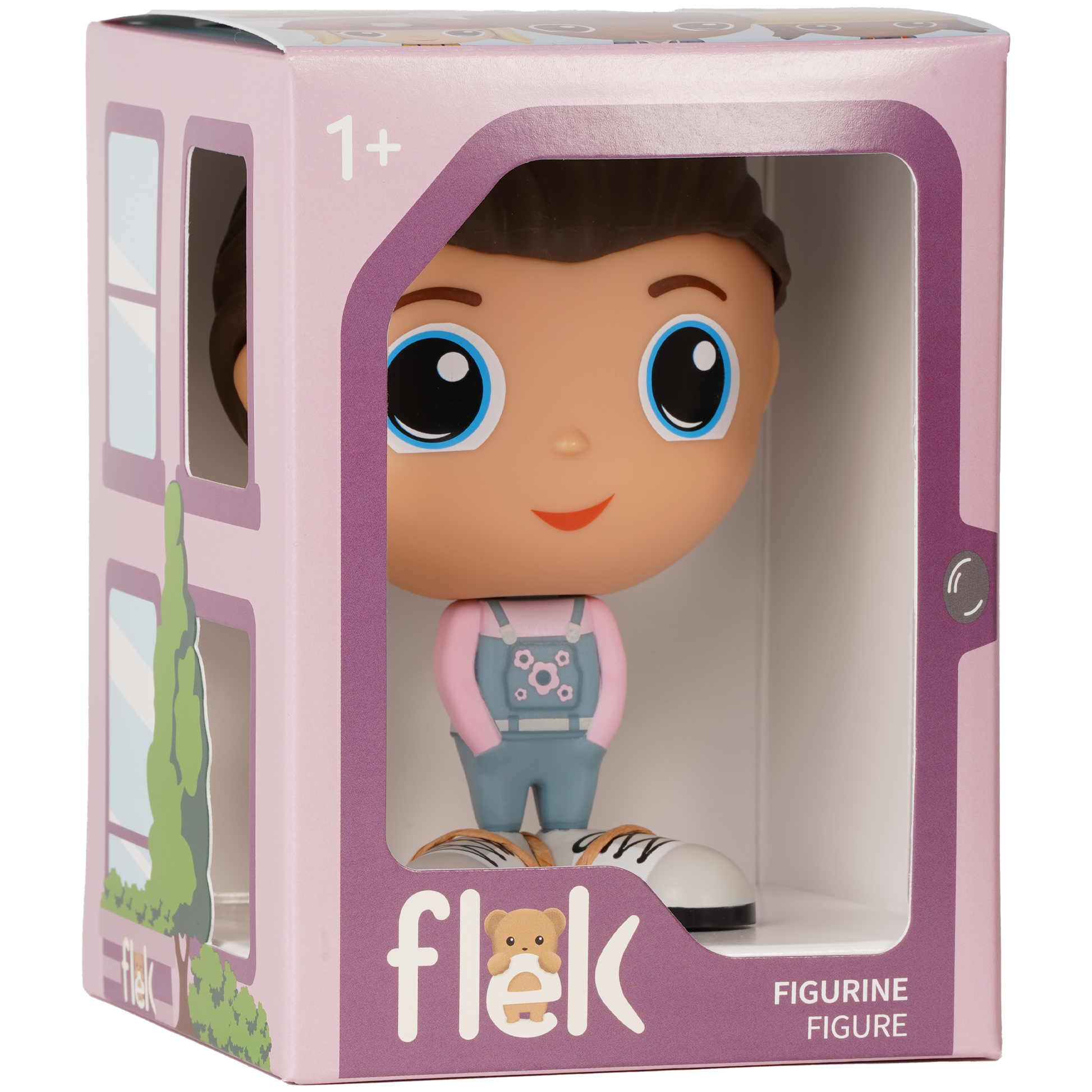 Chaque figurine au parc Flek est prête pour les aventures de plein air avec leur salopette en jean et leur chandail rose. La touche de rose sur les chaussures vient compléter l’ensemble.