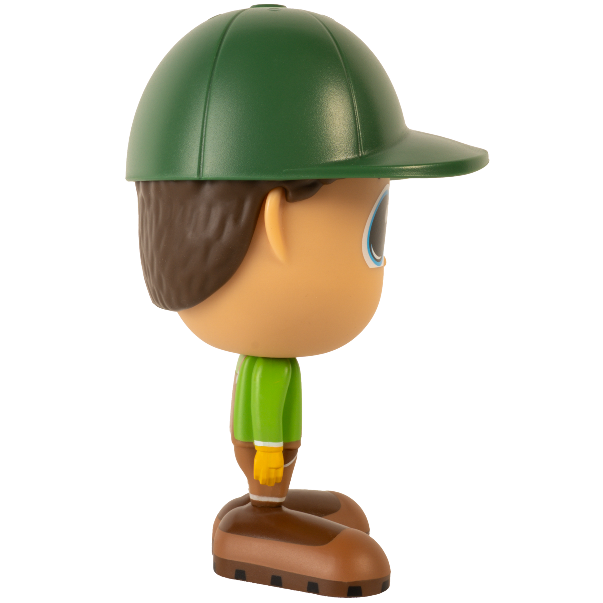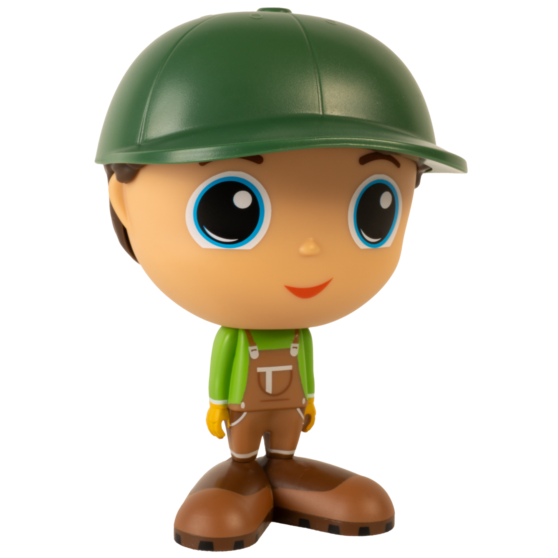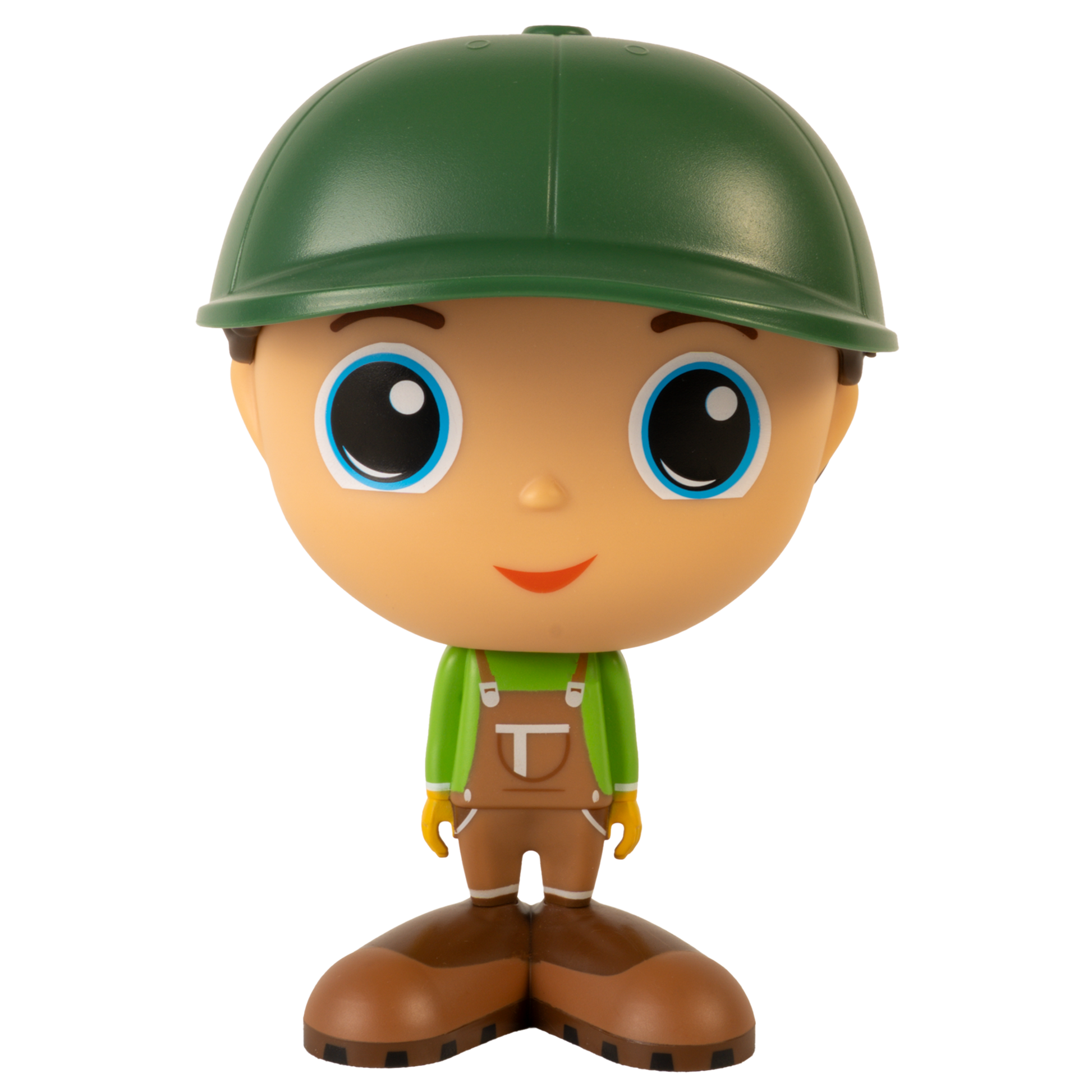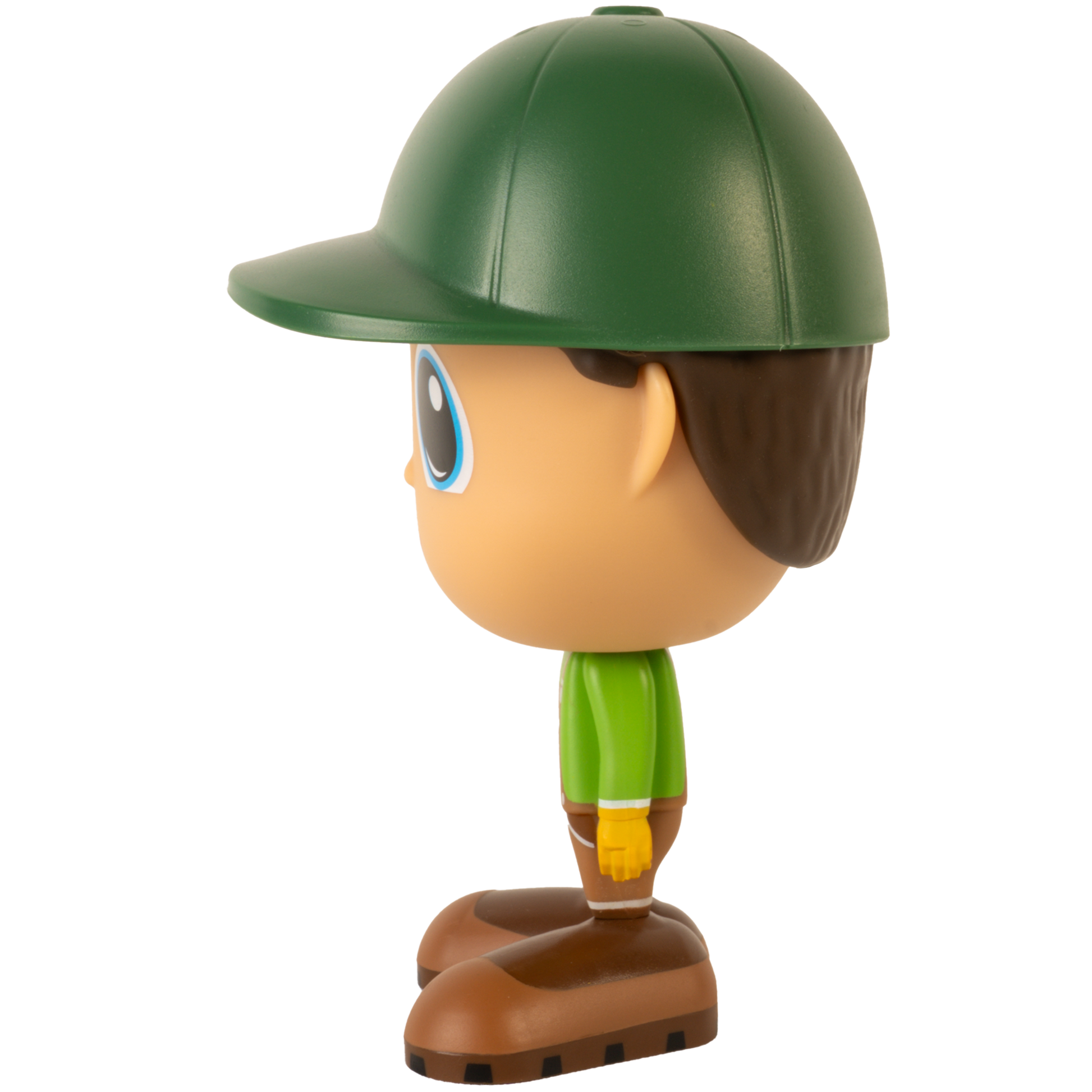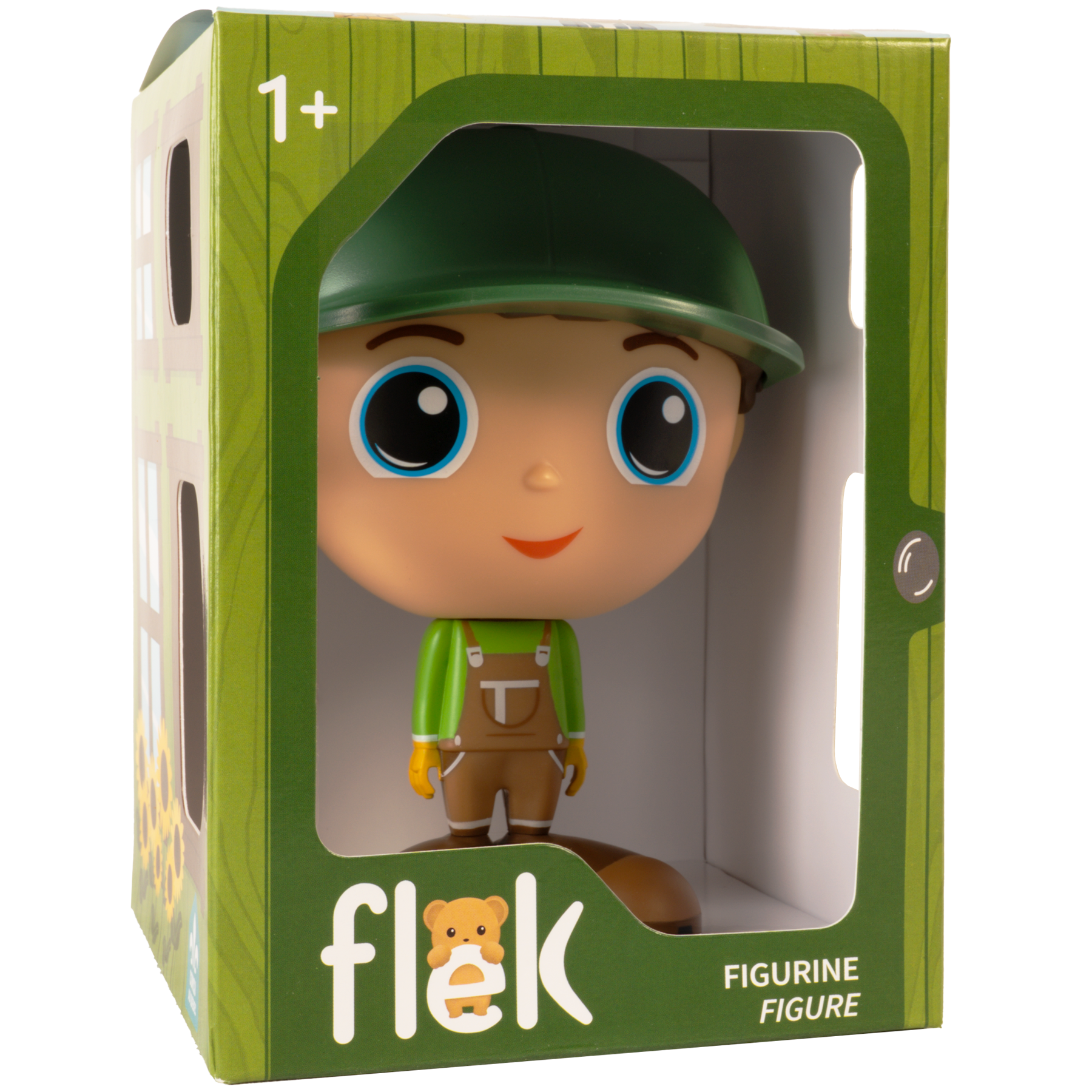 Chaque figurine de fermier Flek porte une chemise verte, une salopette de travail brune et une casquette assortie, parfaites pour les journées bien remplies à la ferme.